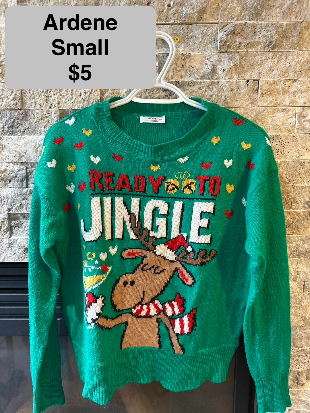 60Green Christmas sweater. Features a moose design and the words "Ready to Jingle". Size small.