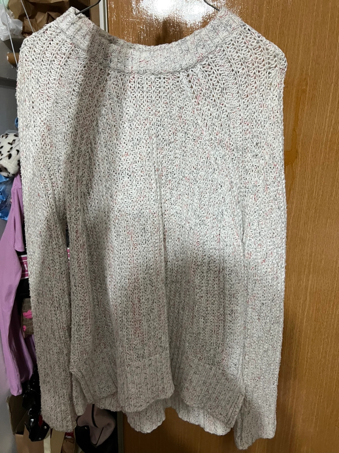 Cream coloured knit sweater. Shorter in the front. Subtle speckles of red and grey throughout.