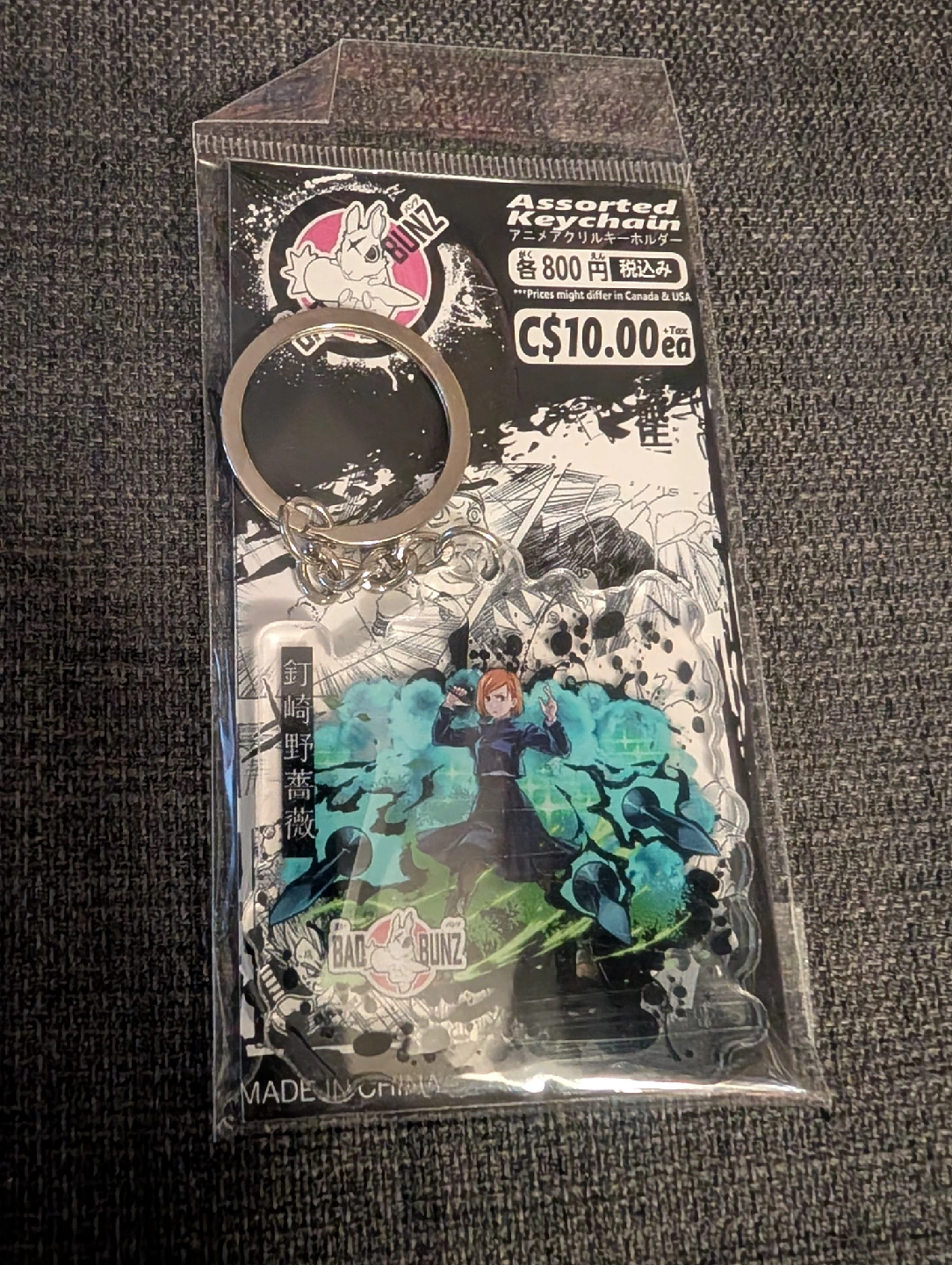 brand new acrylic anime keychain of Nobara from Jujutsu Kaisen by Bad Bunz, still in its original packaging. The keychain features a double-sided custom design and is designed and distributed in Canada. Originally priced at $9.99 CAD plus tax
