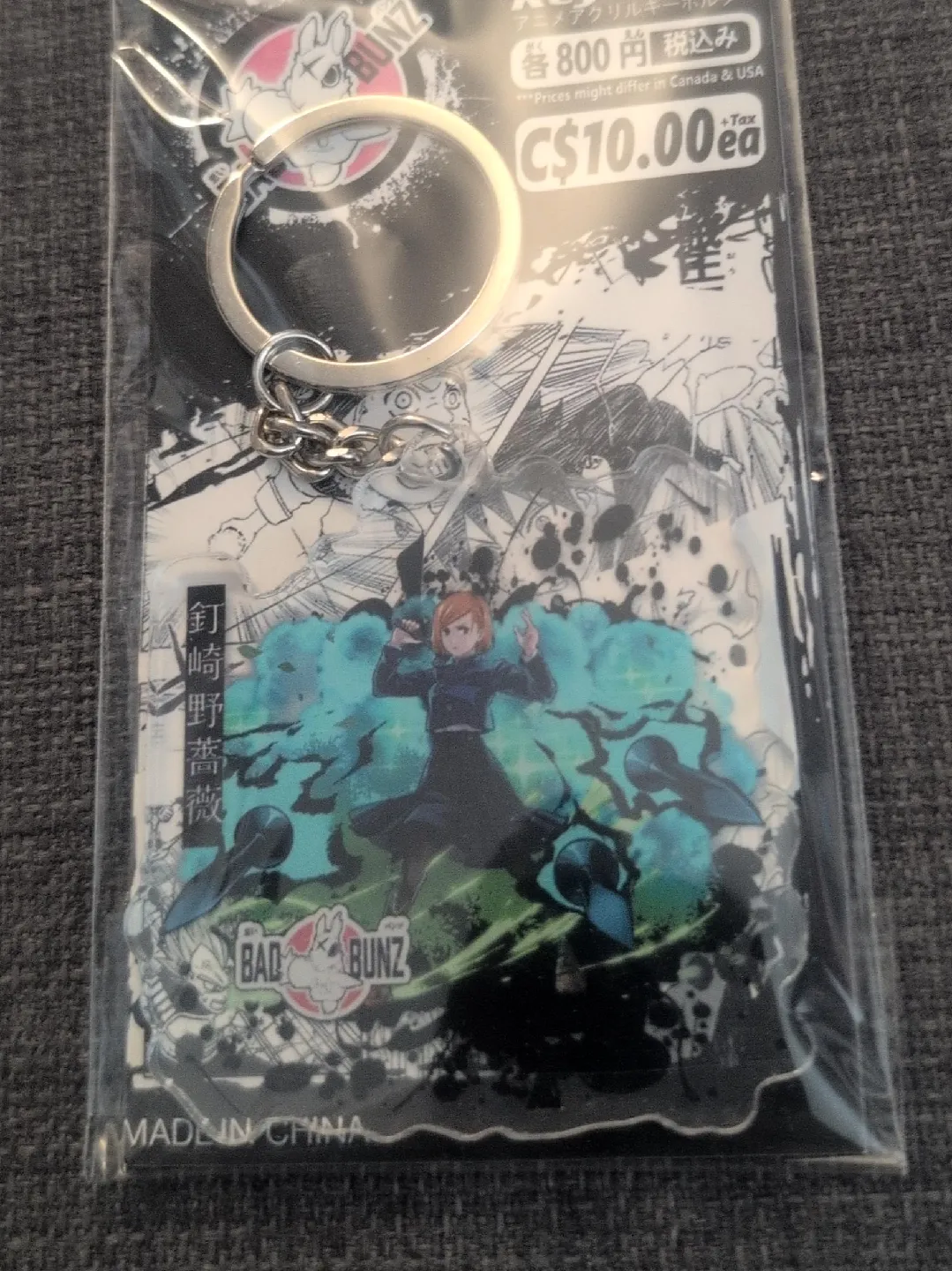brand new acrylic anime keychain of Nobara from Jujutsu Kaisen by Bad Bunz, still in its original packaging. The keychain features a double-sided custom design and is designed and distributed in Canada. Originally priced at $9.99 CAD plus tax