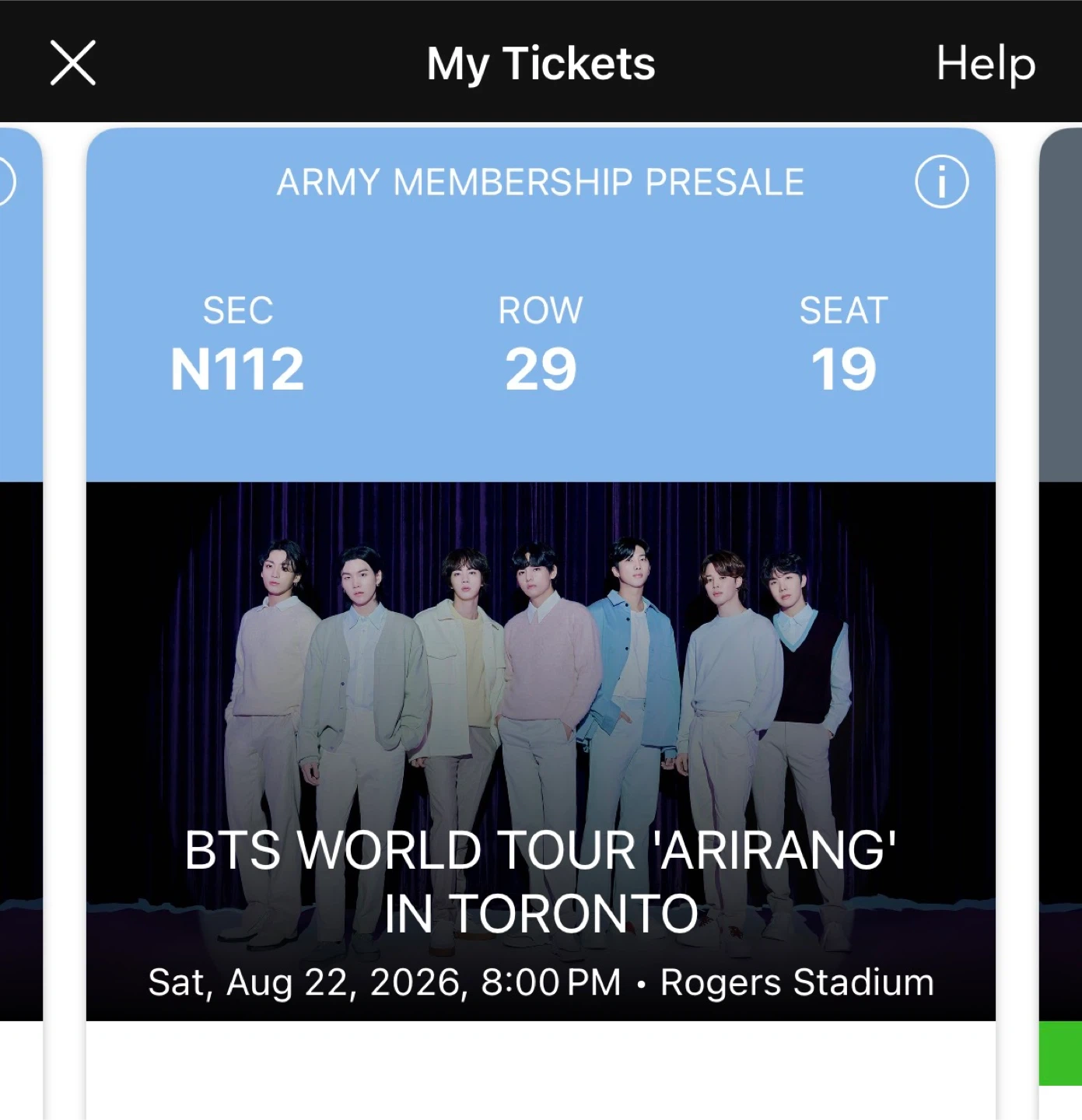 ARMY Membership presale ticket for BTS World Tour 'Arirang' in Toronto. Seat N112, Row 29, Seat 19 at Rogers Stadium on Saturday, August 22, 2026, 8:00 PM.