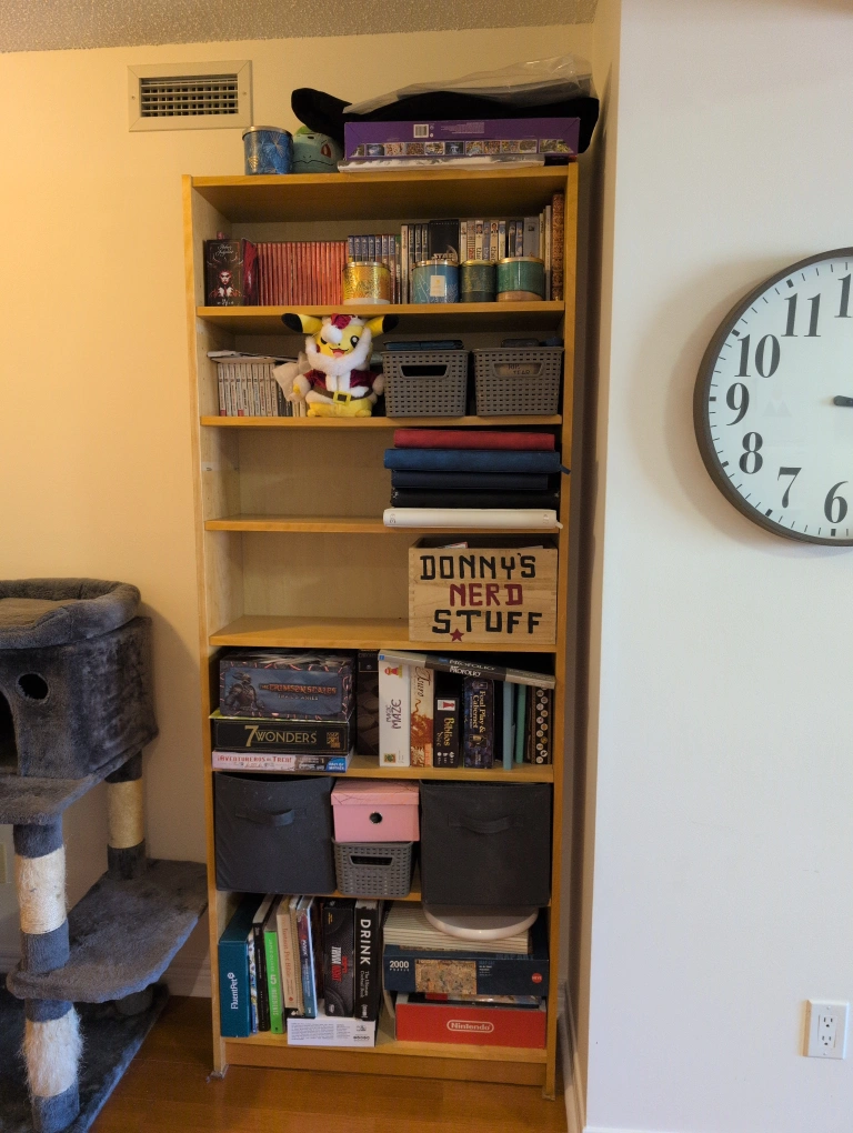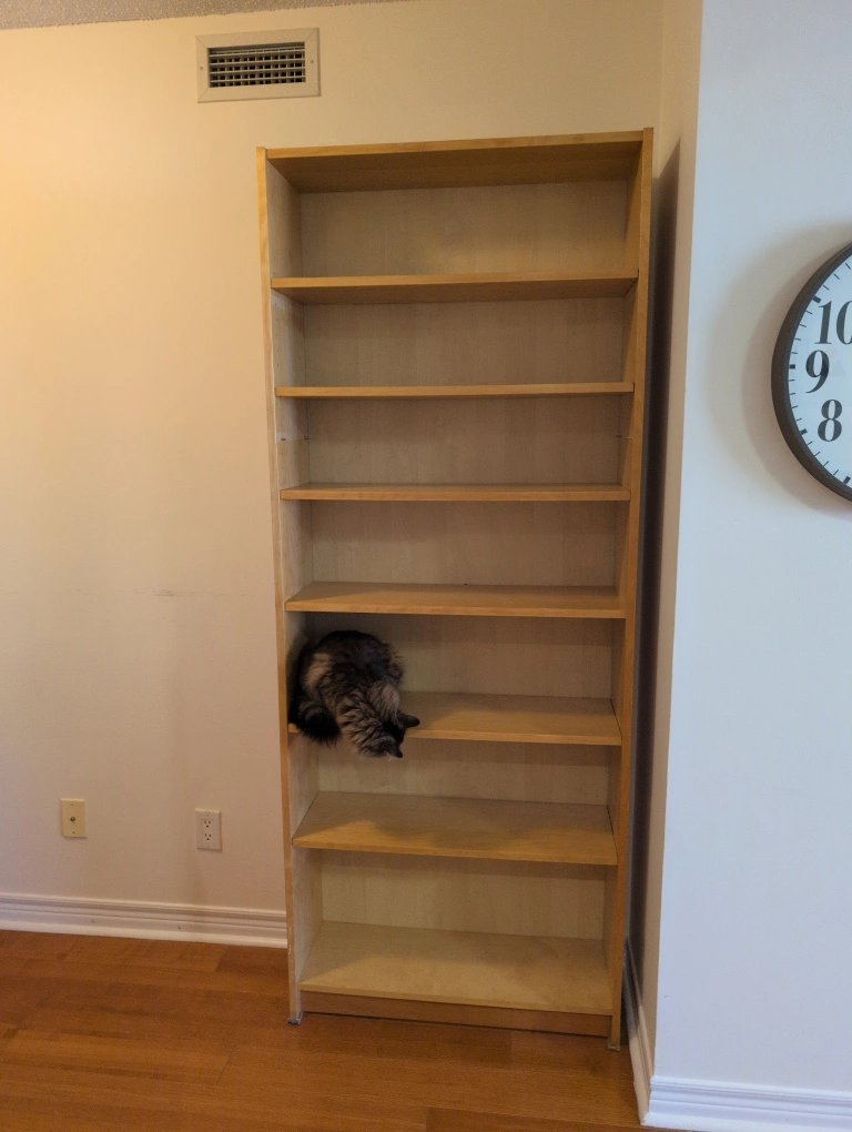 Selling a tall wooden bookshelf! It's in decent shape and ready to hold all your books and treasures. Some of the wood coloring has faded due to sun exposure. all shelves but the middle one can be slid out and moved around.pick up only, as is.
