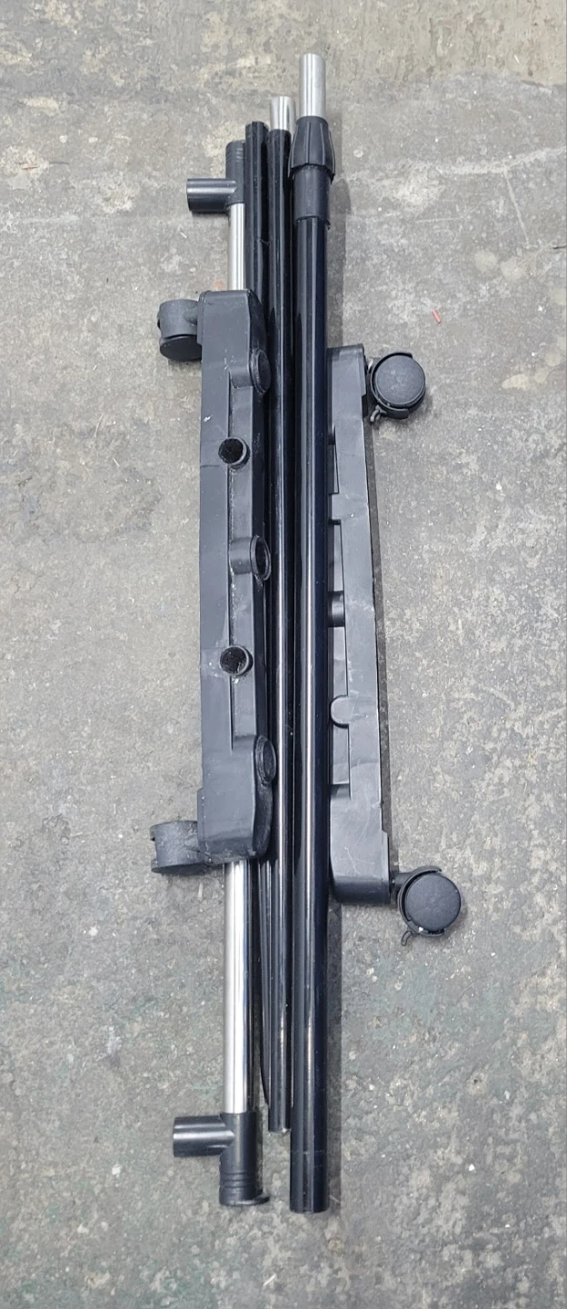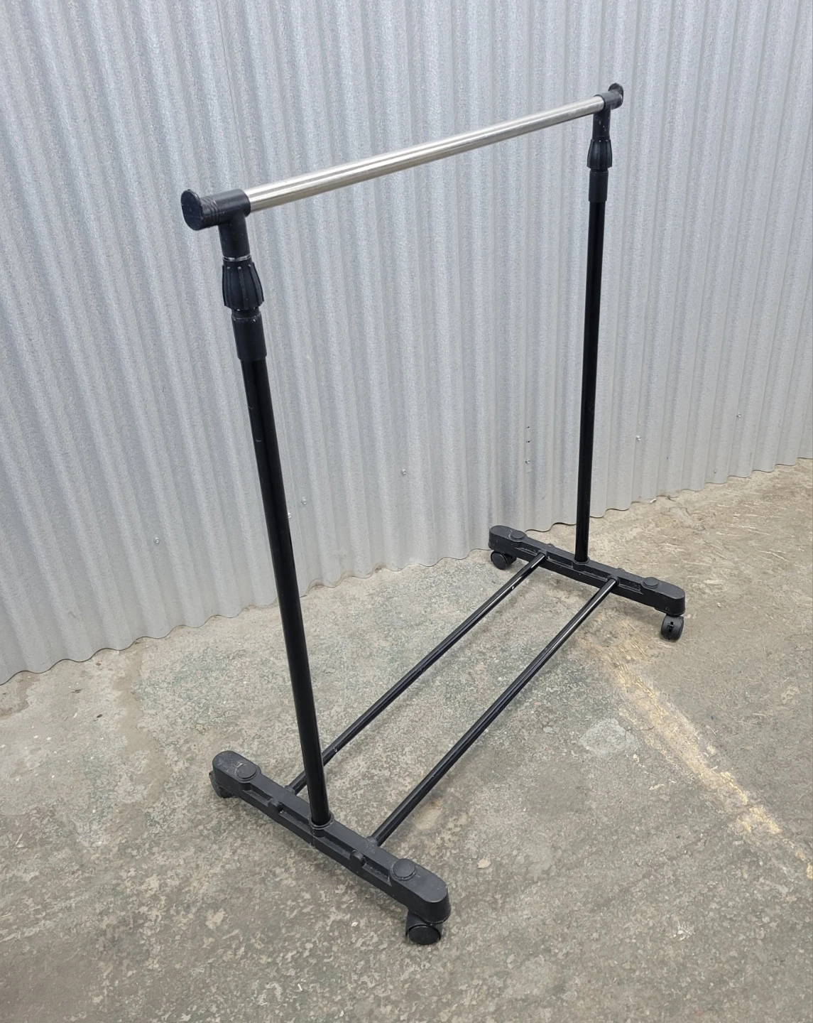 This is a portable garment rack with a metal hanging bar and a black base. It features wheels for easy mobility. The rack is collapsible for storage. Some minor scuffs on the metal bar are visible.