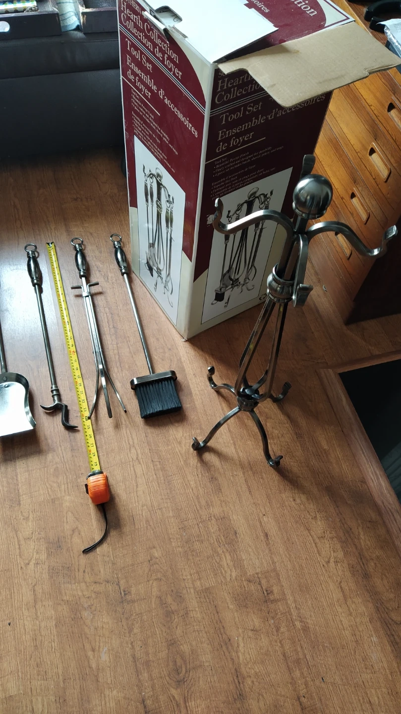 This 4-piece fireplace tool set includes a brush, shovel, poker, and tongs. It features a beautiful Pewter Finish and is finely crafted for durability. Perfect for maintaining your fireplace!