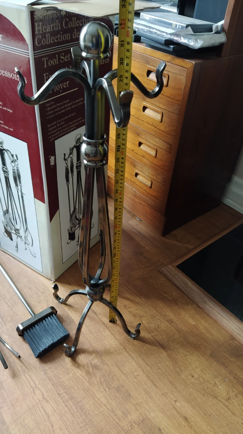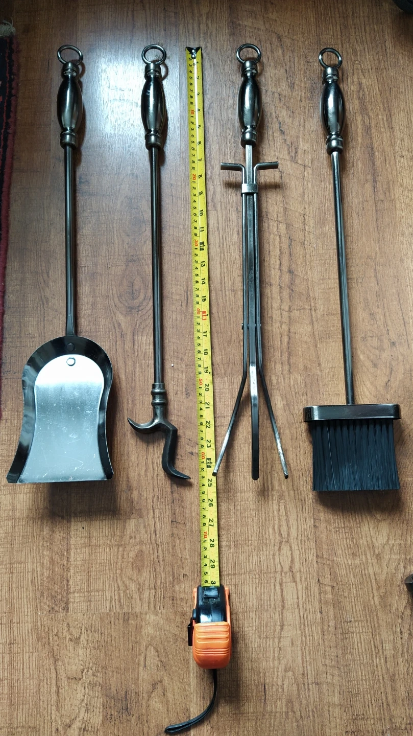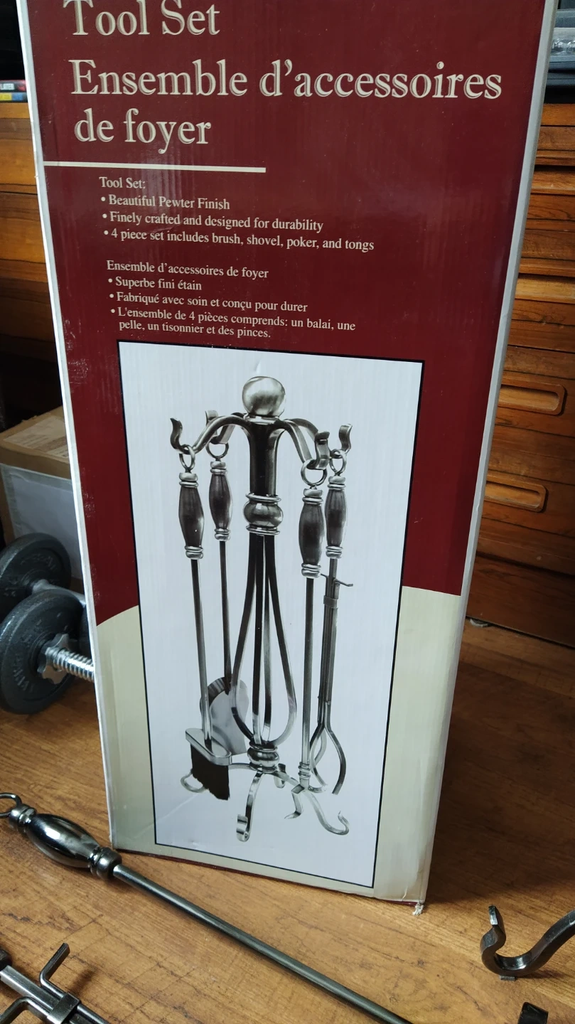 This 4-piece fireplace tool set includes a brush, shovel, poker, and tongs. It features a beautiful Pewter Finish and is finely crafted for durability. Perfect for maintaining your fireplace!