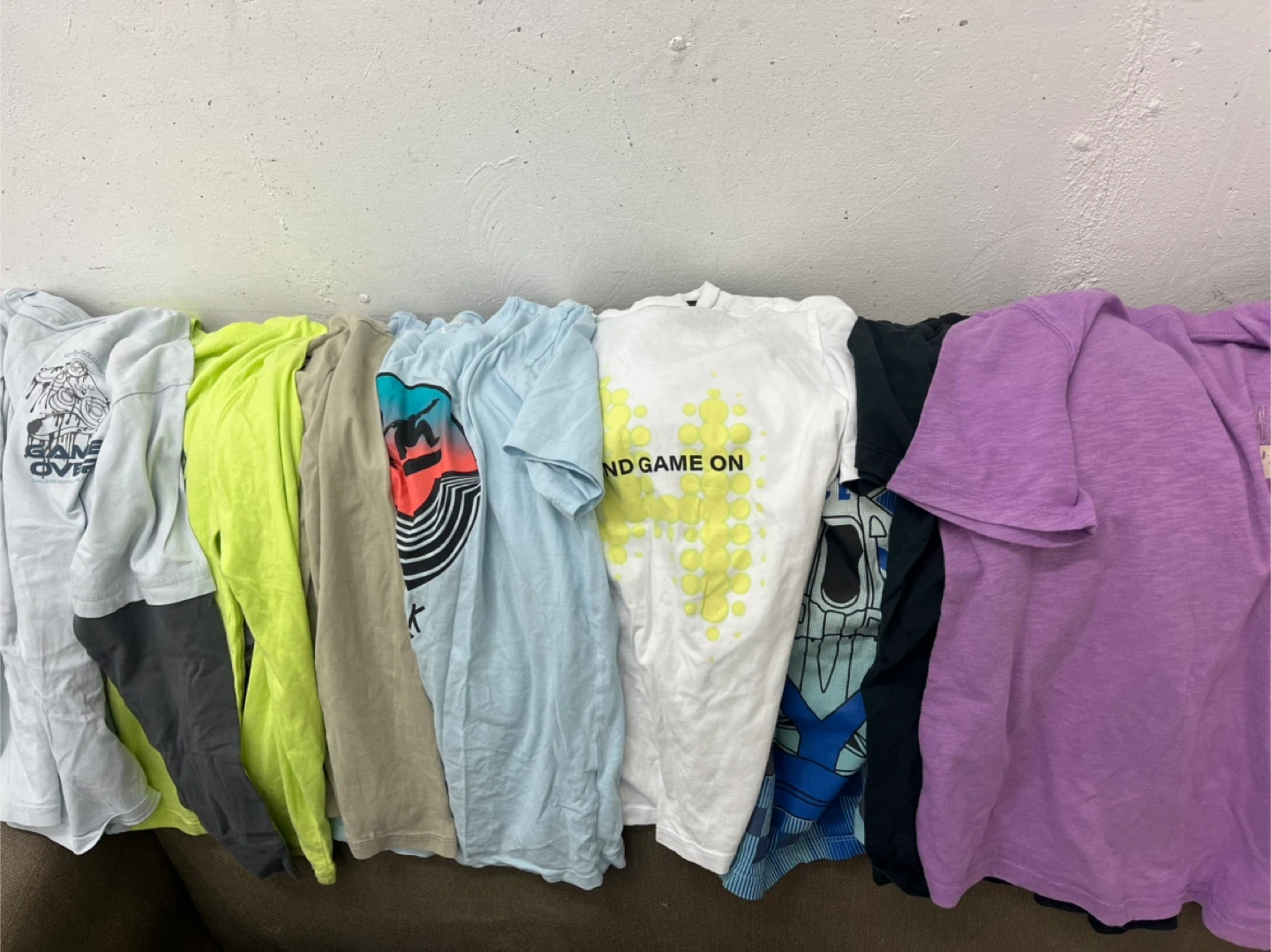 A collection of boys’ tops and bottoms. Includes graphic t-shirts and casual pants. Various colours and styles are present.