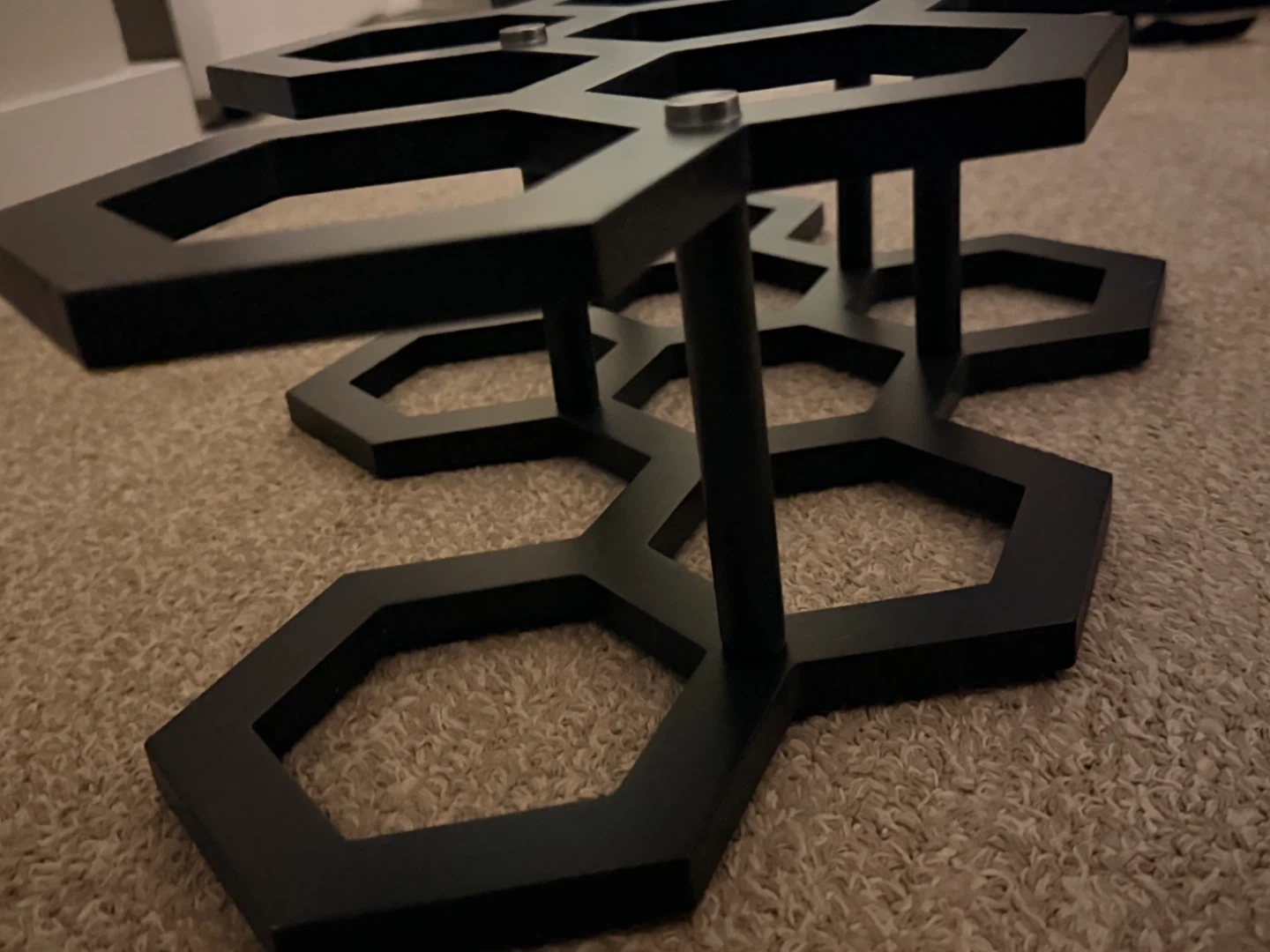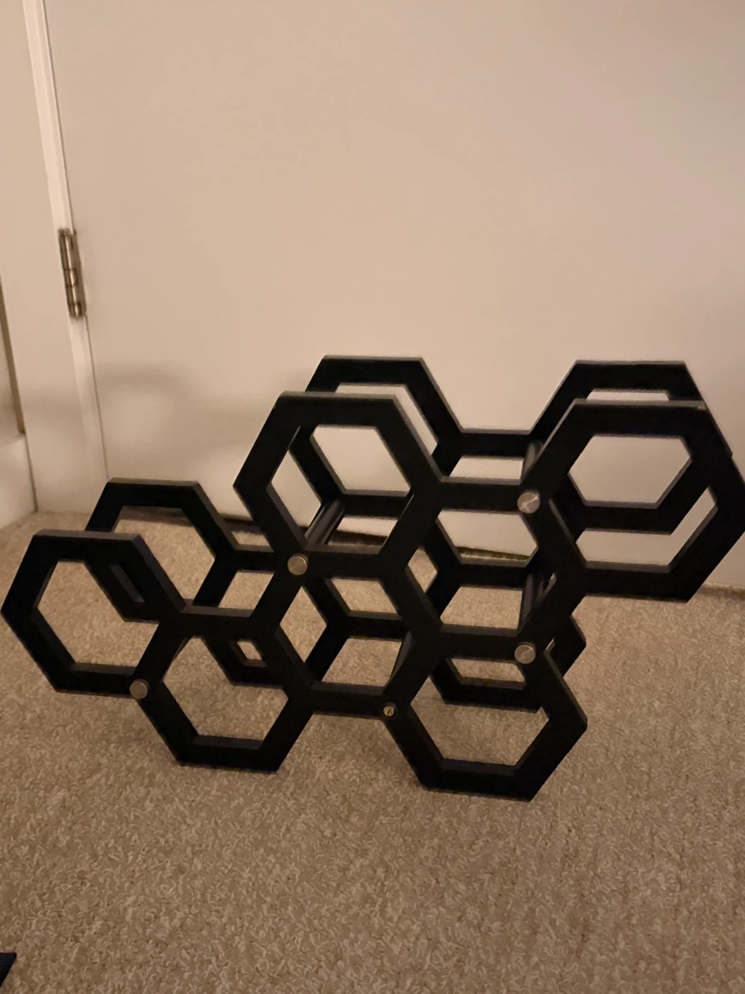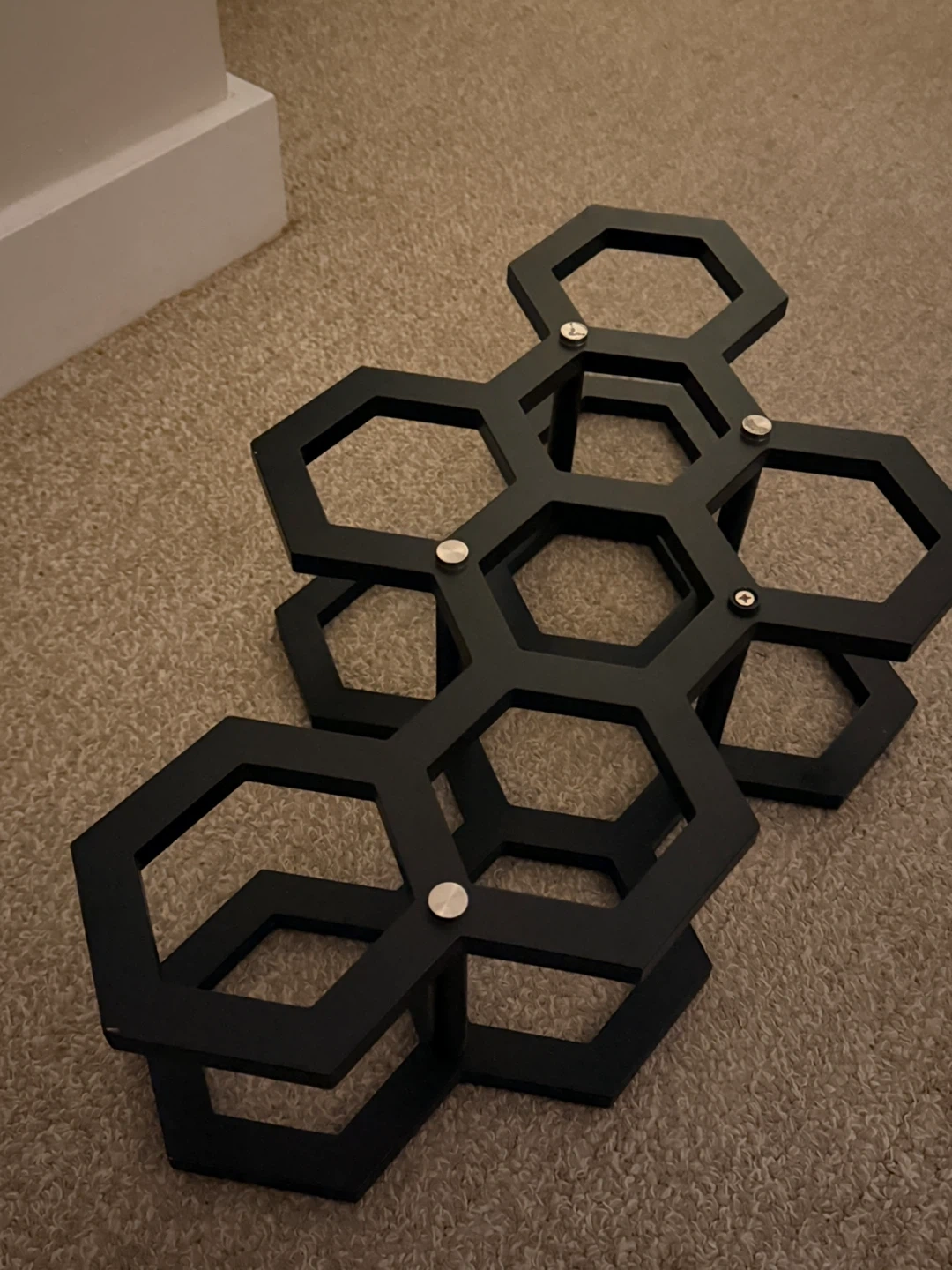 This black wine rack holds multiple bottles in a unique hexagon design. It's made from a sturdy material and is perfect for organizing your wine collection.