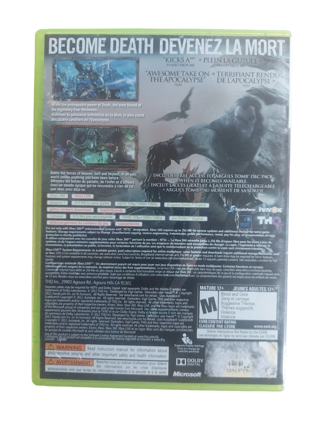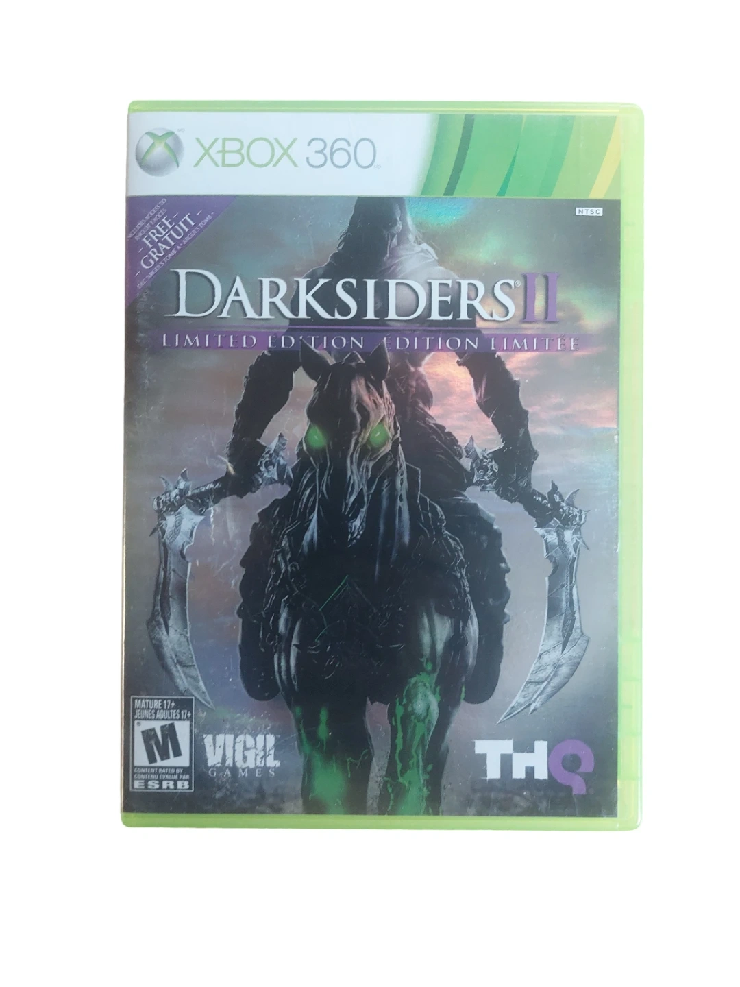 Darksiders II Limited Edition for Xbox 360. It includes the main game plus the "Argul's Tomb" DLC. System Requirements include 256 MB for system cache and 10GB for game storage.