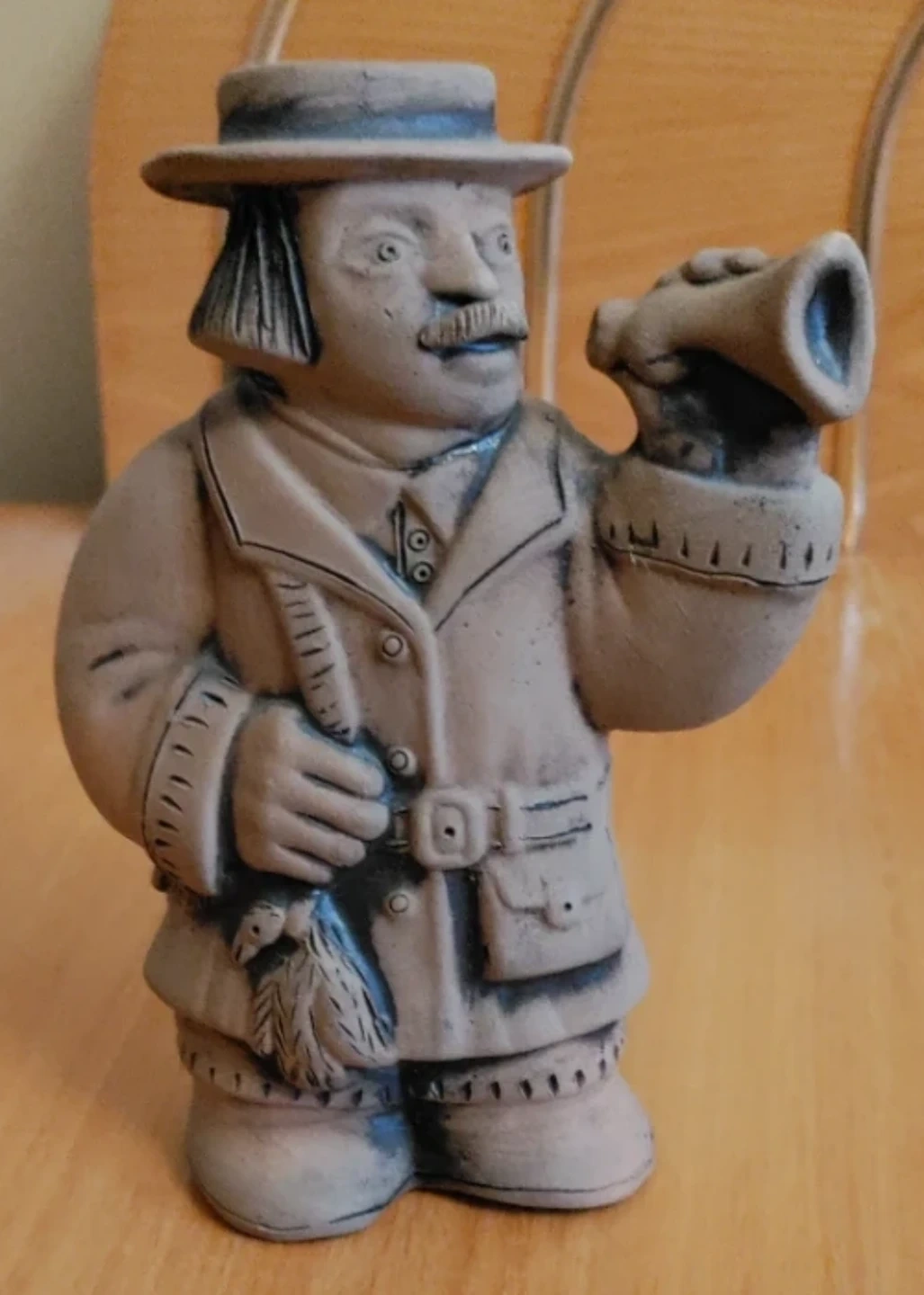 This is a charming ceramic figurine of a man dressed in a hat and coat, holding binoculars and a feather. It's a unique decorative piece with a rustic finish. This piece would add character to any shelf or display cabinet!