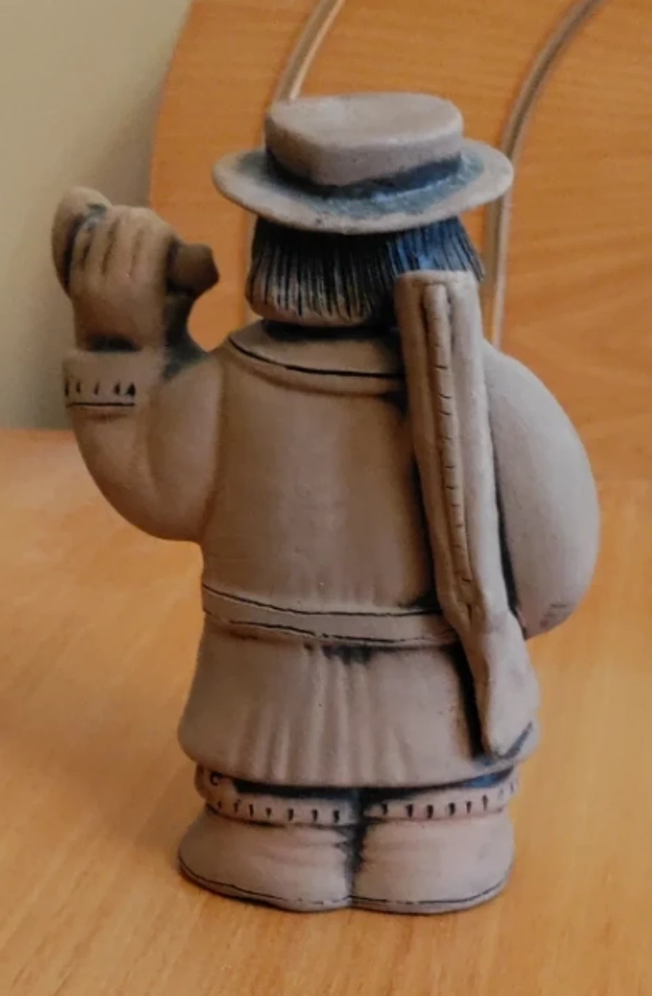 This is a charming ceramic figurine of a man dressed in a hat and coat, holding binoculars and a feather. It's a unique decorative piece with a rustic finish. This piece would add character to any shelf or display cabinet!