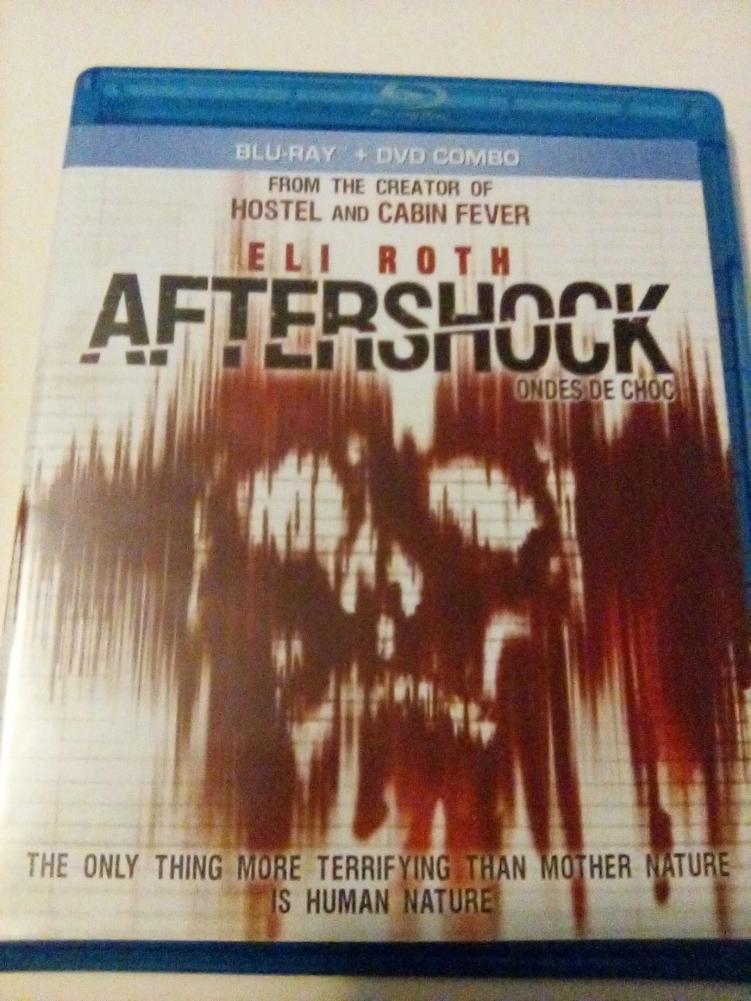 Aftershock Blu-Ray + DVD combo. Features include audio commentary with Eli Roth and "The Making of 'Aftershock'" bonus feature. Running time is 89 minutes. Original theatrical release was in 2012.