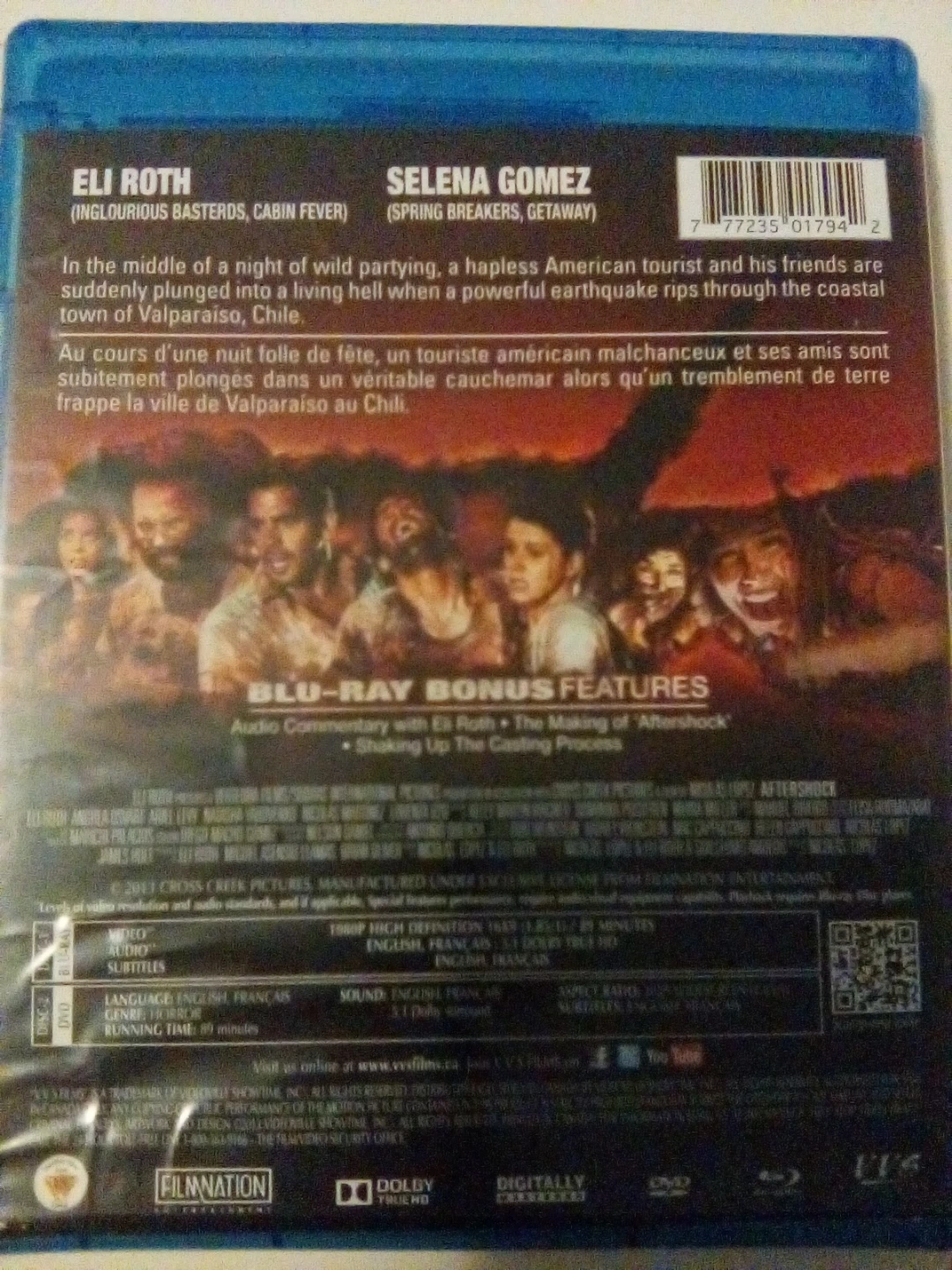 Aftershock Blu-Ray + DVD combo. Features include audio commentary with Eli Roth and "The Making of 'Aftershock'" bonus feature. Running time is 89 minutes. Original theatrical release was in 2012.