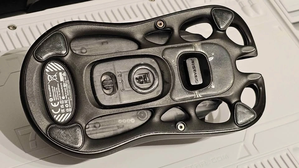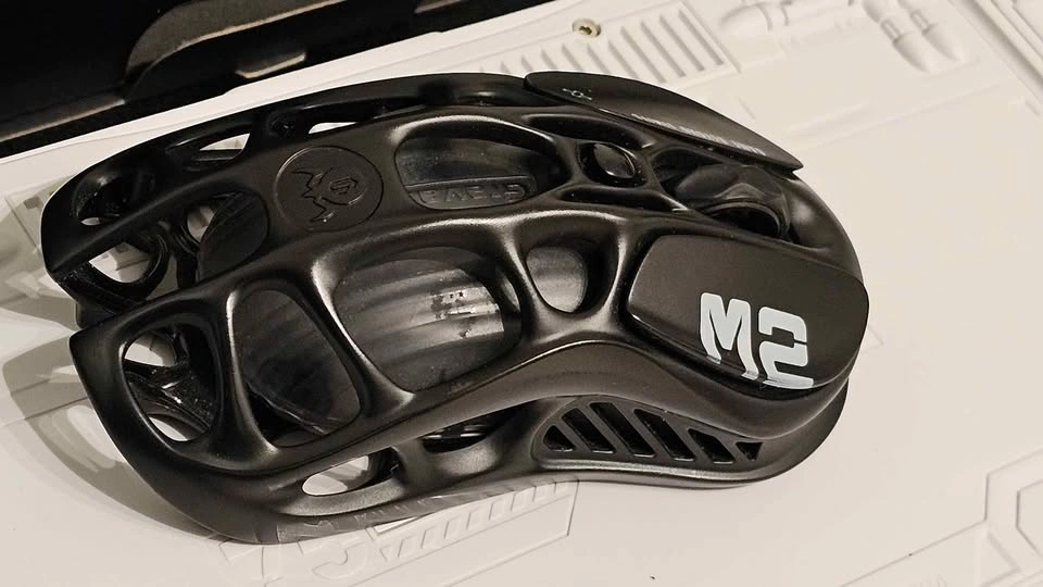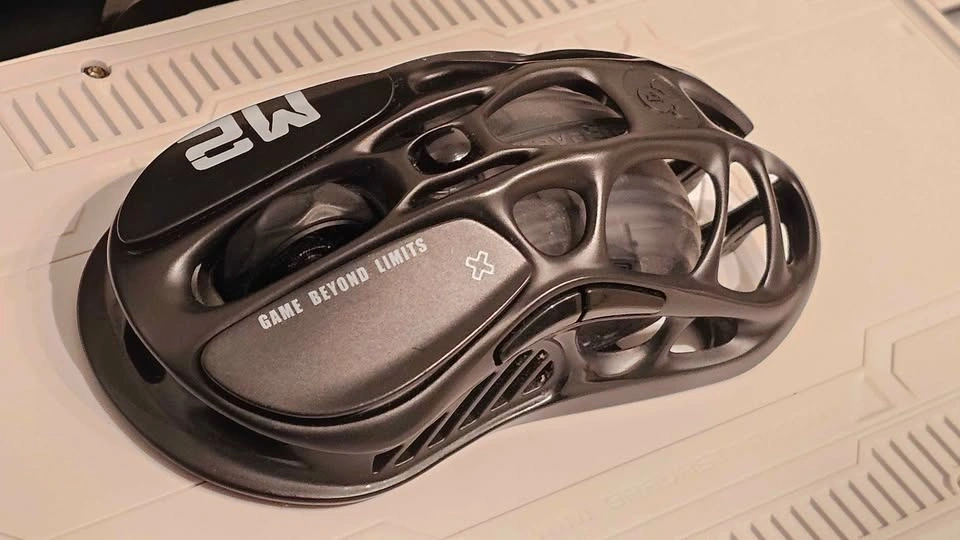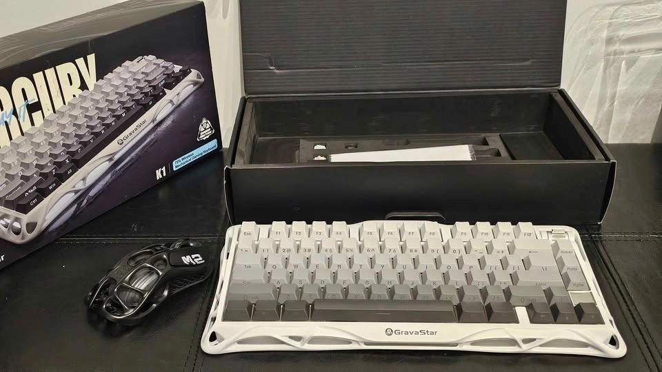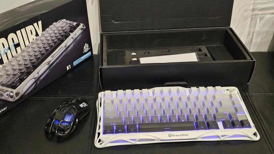 Mechanical gaming keyboard with a unique white hollow-carved aluminum alloy frame and RGB lighting. This 75% layout wireless model comes with the original box, cleaning cloth, and spare switches. Set includes a matching black GravaStar Mercury M2 wireless gaming mouse with a similar skeletonized design. Mouse is new.