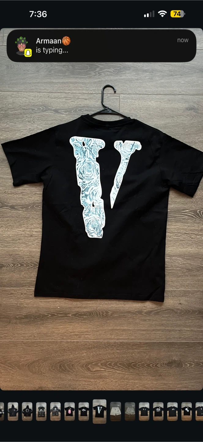 This is a black VLONE t-shirt with "The Woo" graphic on the front and a V logo on the back. It's made of cotton. Available in sizes Small, Medium, and Large.