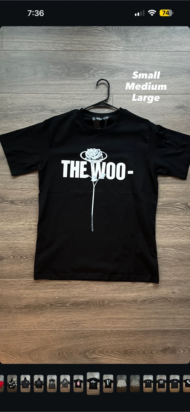 This is a black VLONE t-shirt with "The Woo" graphic on the front and a V logo on the back. It's made of cotton. Available in sizes Small, Medium, and Large.