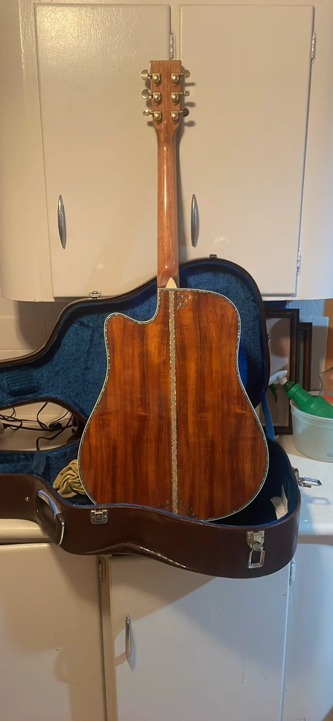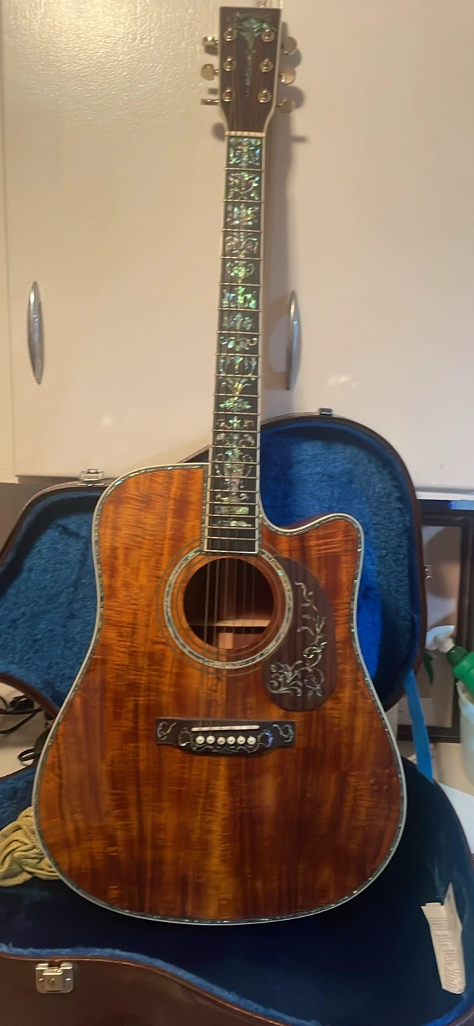 Acoustic guitar with beautiful inlay work on the fretboard and body. It's in a hard case and looks like it's made of mahogany. The headstock says Martin but it is NOT a Martin. Plays and sounds great but it is NOT a genuine Martin. Has a pickup in it as well. Great to play but also a great as a display piece. In great condition!