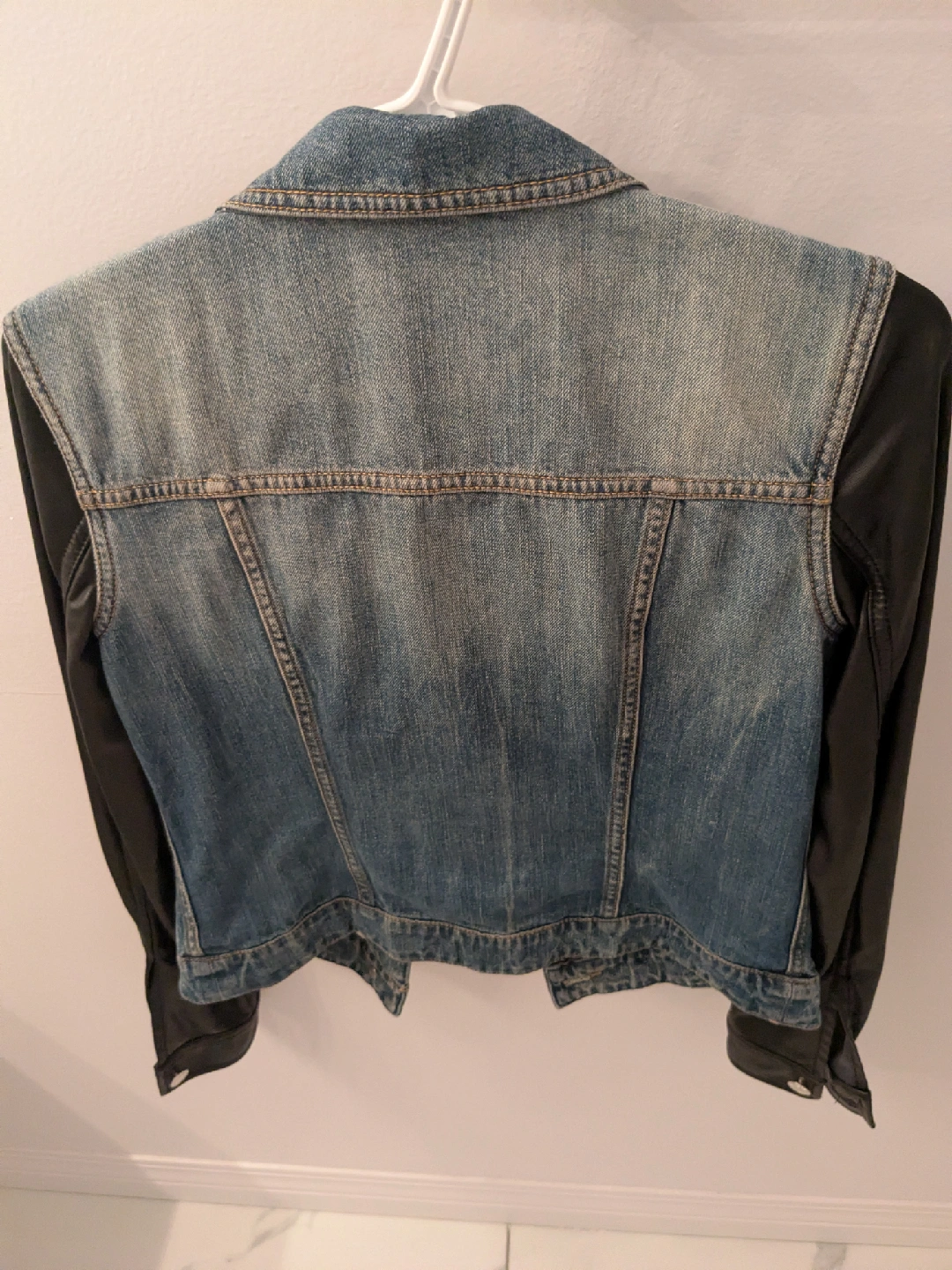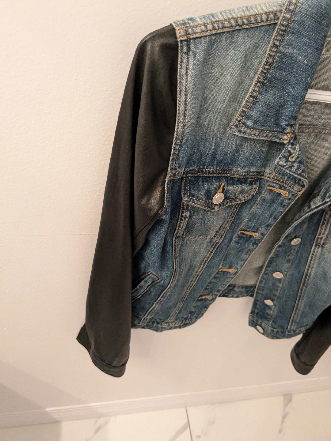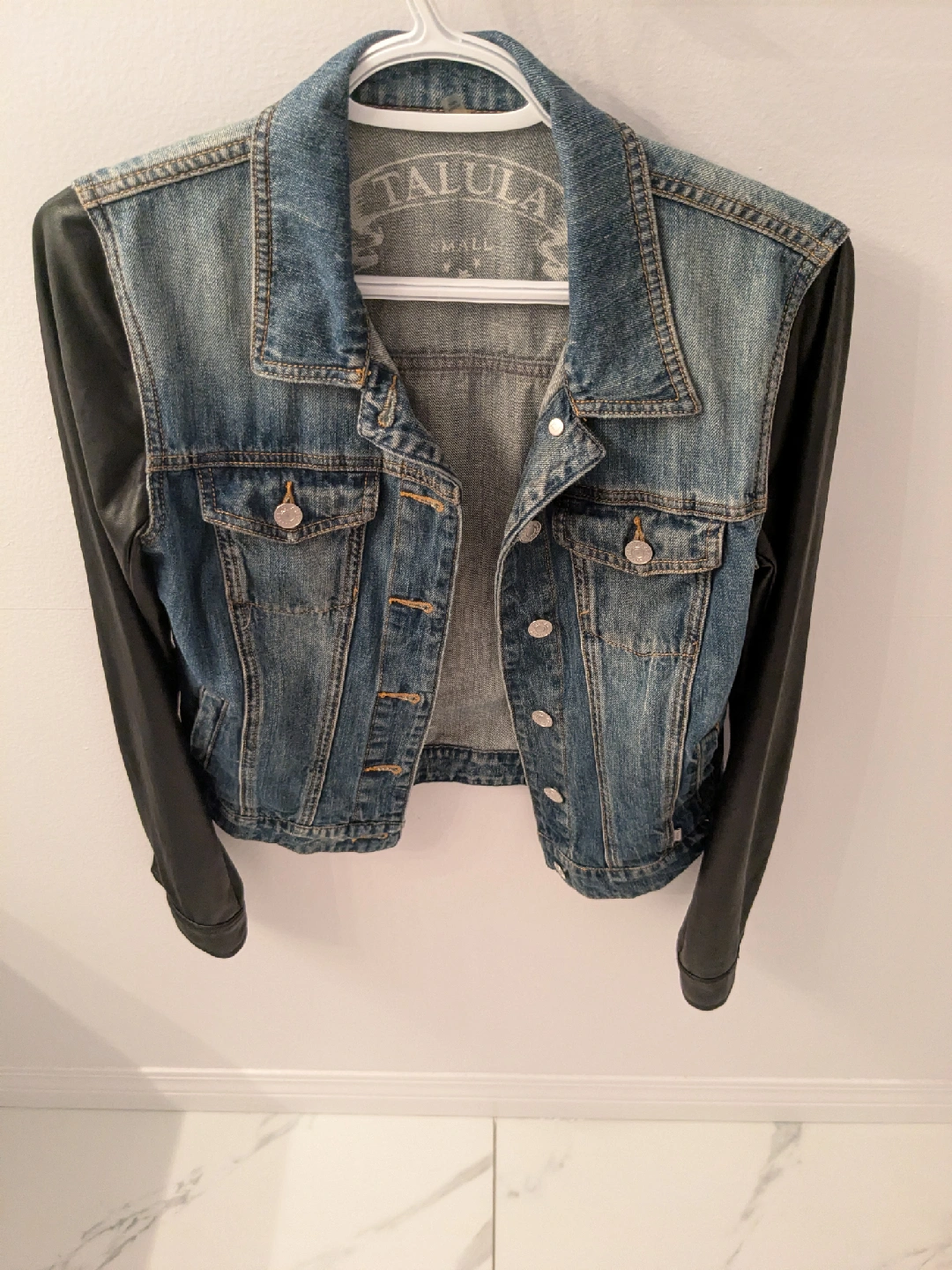 231This is a cute Talula denim jacket with black faux leather sleeves. It's in great condition and a size small. Perfect for adding a bit of edge to your outfit! pickup only cash only please