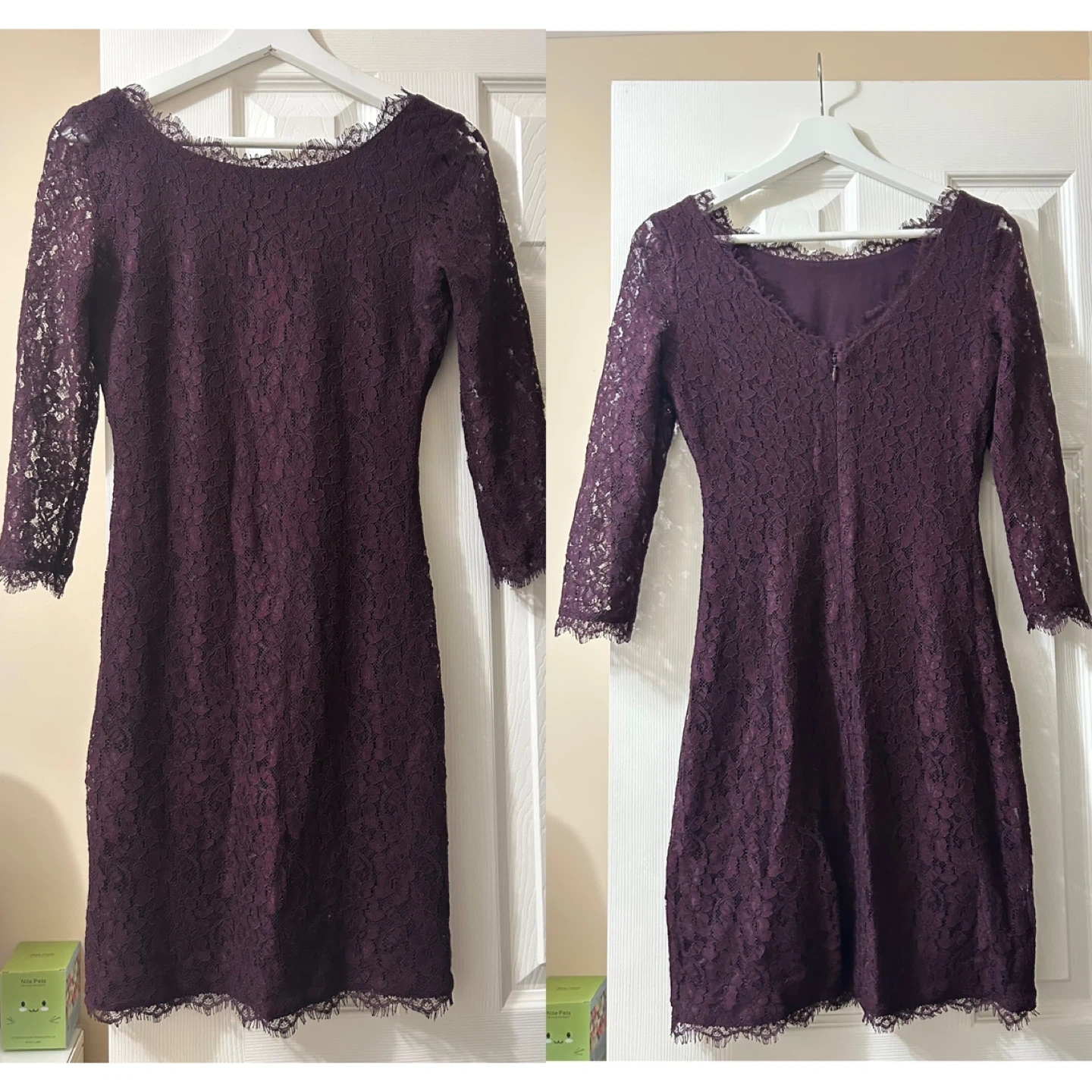 38This is a Aritzia Babaton burgundy lace slim dress. It features delicate lace detailing and a flattering fit. This material is stretchy. The sleeves are made of sheer lace, creating a see-through effect, while the body part is lined with a underskirt. It features a zipper closure that runs down the back all the way to the hip area It's perfect for a special occasion or a night out. Size is 2.