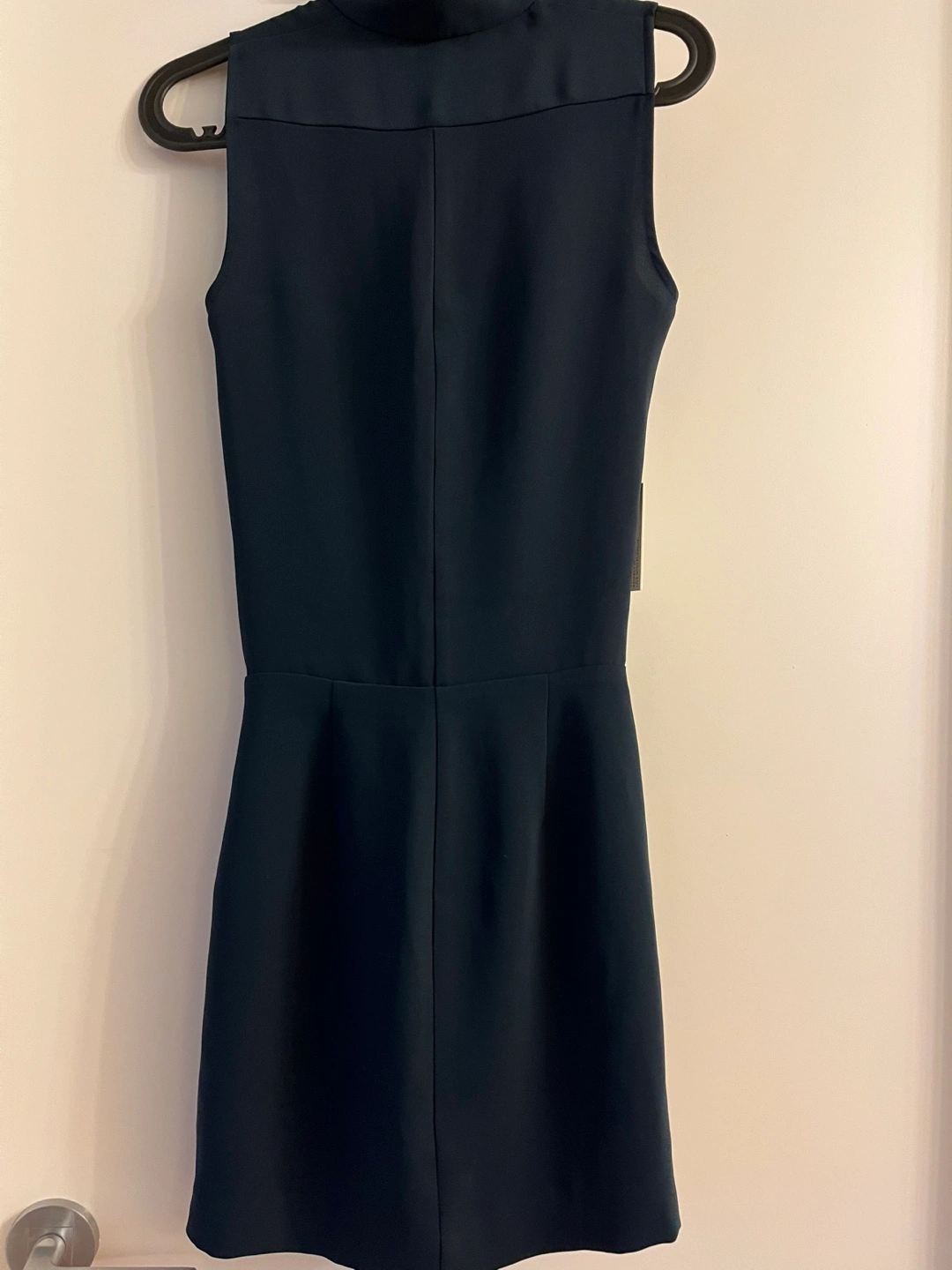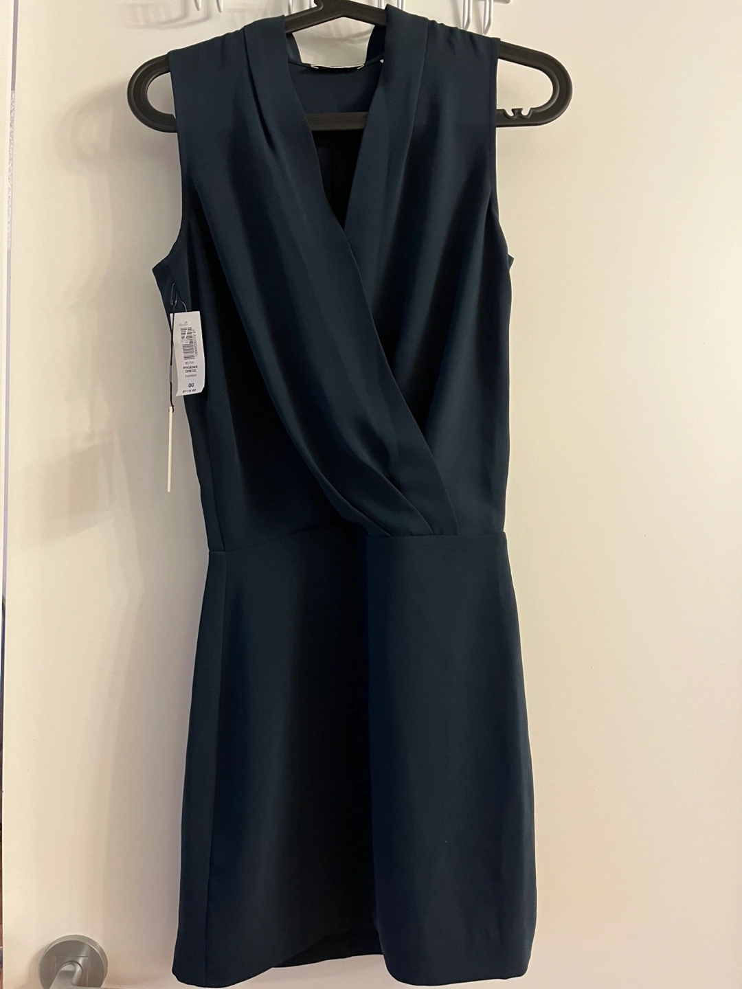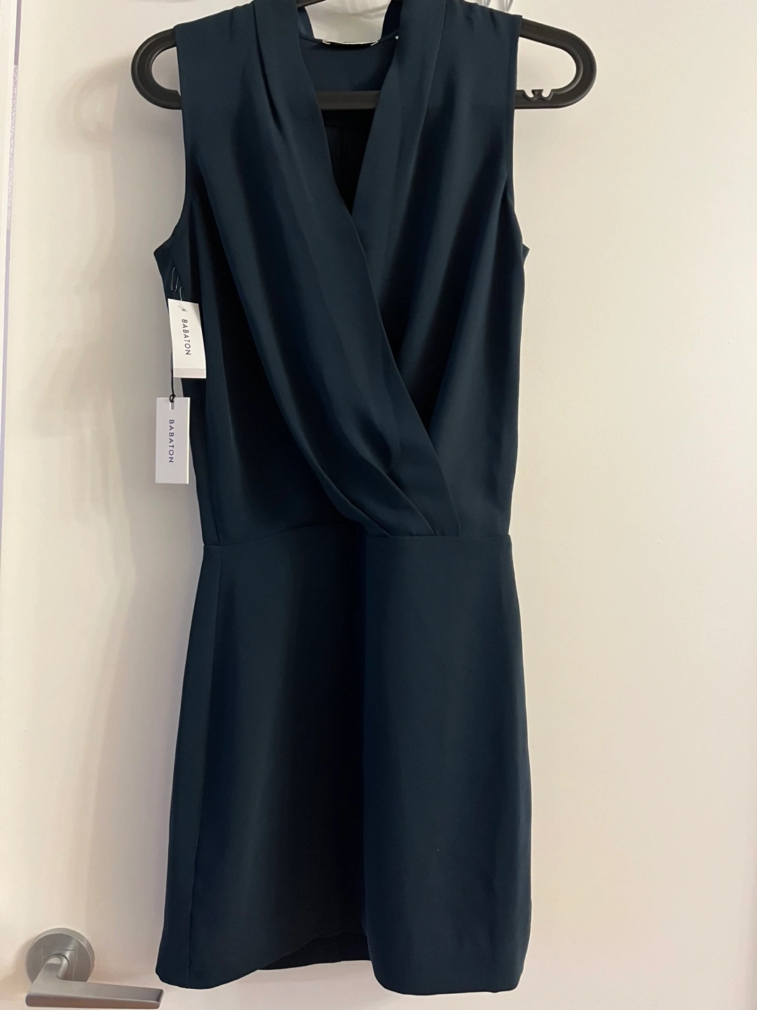 Sleeveless dress with a beautiful, classic v-neck and a wrap-style bodice. It's a fitted style that ends above the knee. Evergreen colour, so it’s a perfect holiday dress. Side zipper along the hip area.