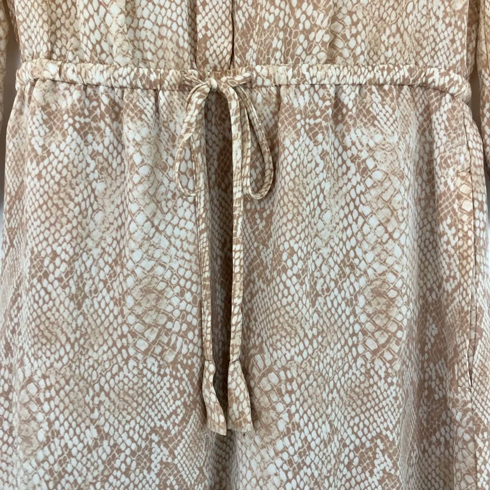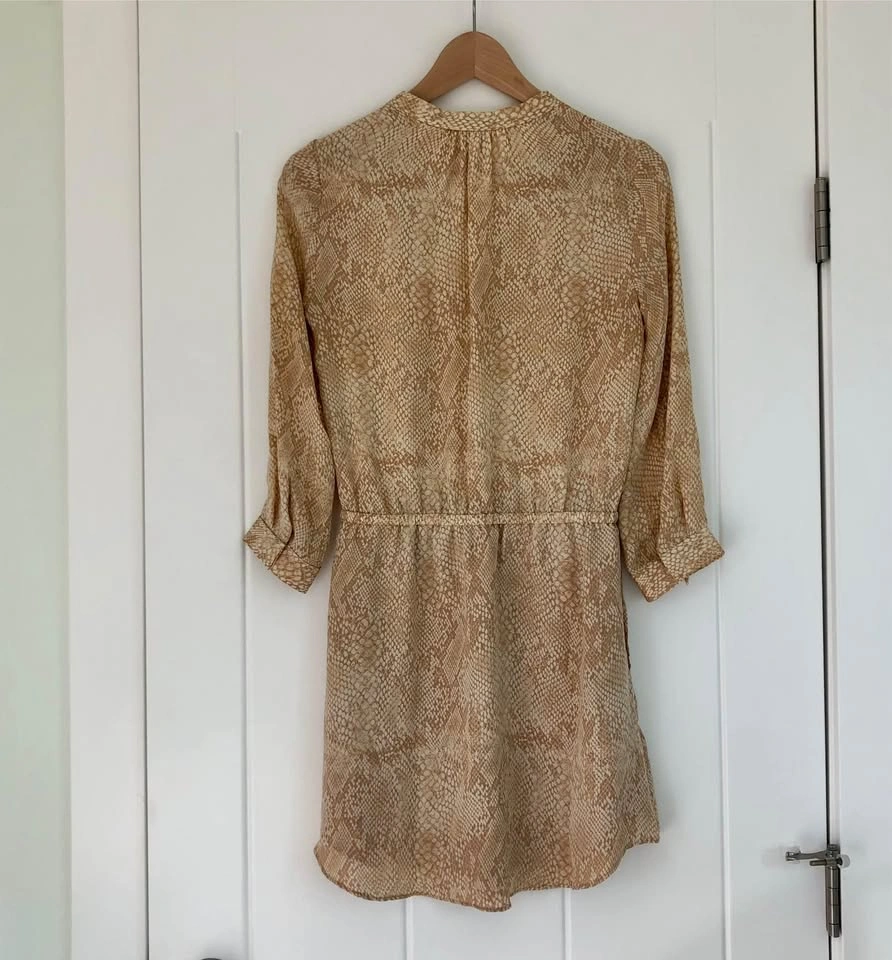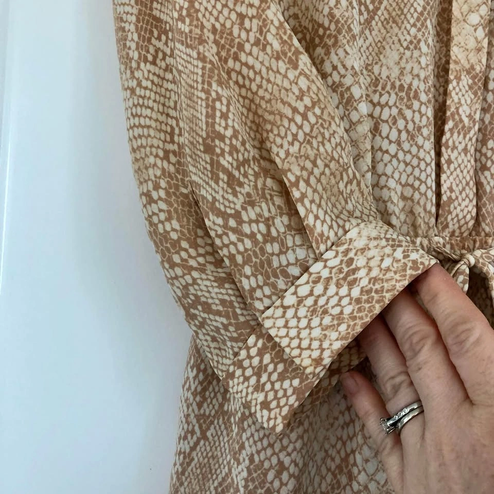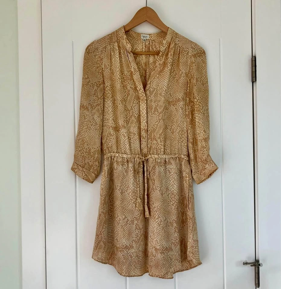 Stunning Aritzia Babaton Bennett long sleeve floral dress with very flattering & fun allover snake print. Hidden buttons on cuff and chest with a drawstring tie at the waist. This beautiful dress is in very good pre-loved condition and features a semi-sheer bodice with a lined skirt. The model photo is included to illustrate fit only. Women’s Size XS 100% Silk