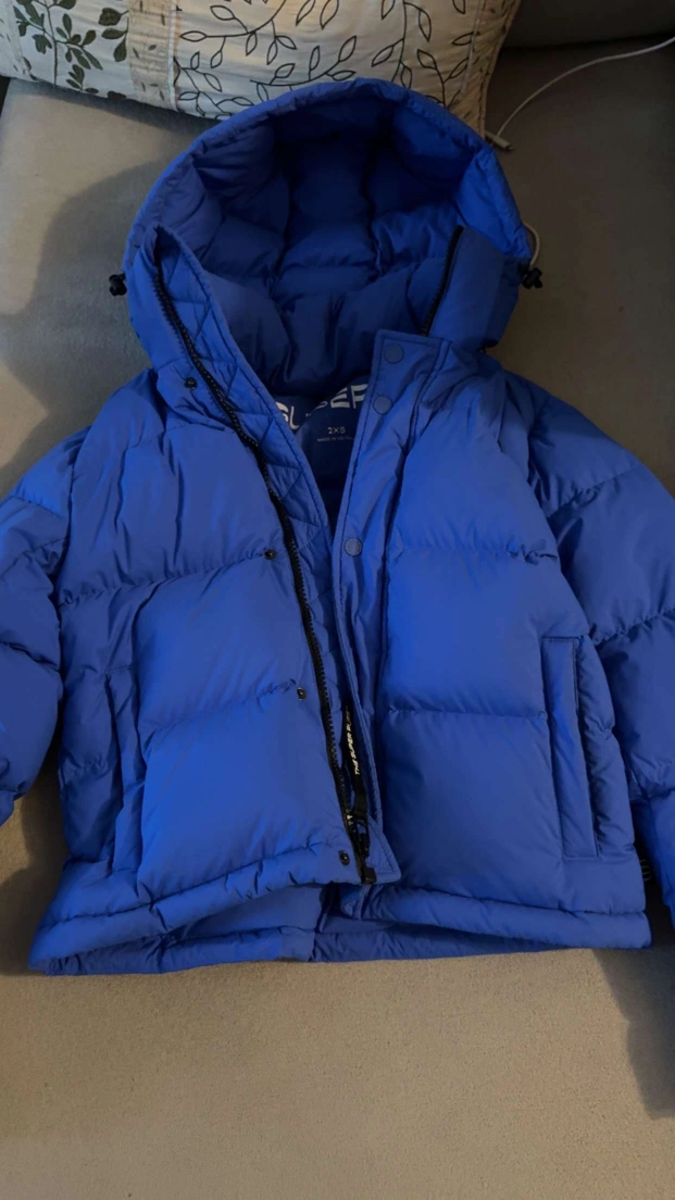 Selling a Super Puff Shorty jacket in a vibrant blue! It's a size XXS