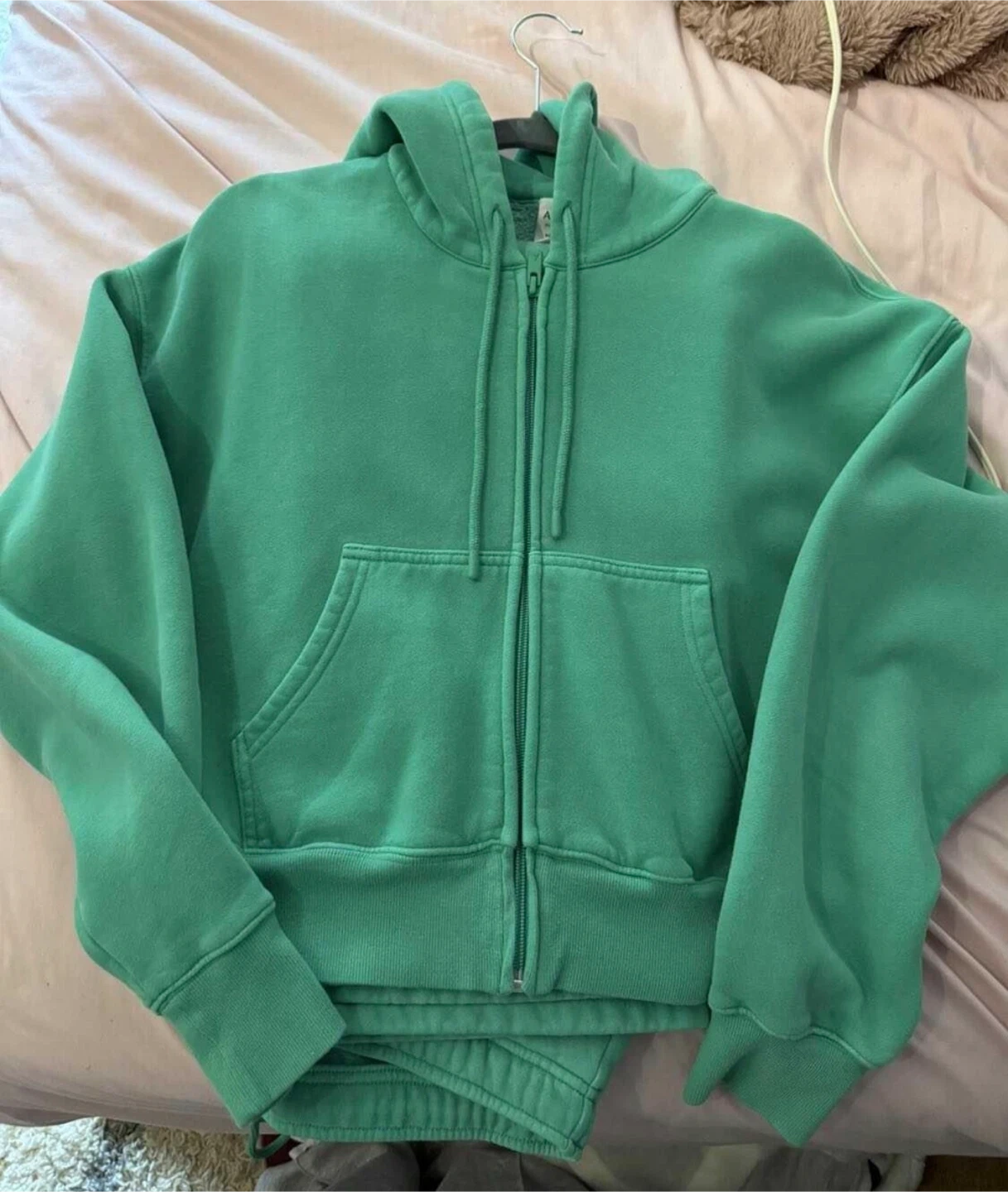 81Selling an Aritzia Sweatfleece set in a lovely green colour! The hoodie is a Boyfriend Fit crop and the bottoms are mega fleece sweats. The top is a medium and the bottoms are a large.It's super comfy and in great condition!