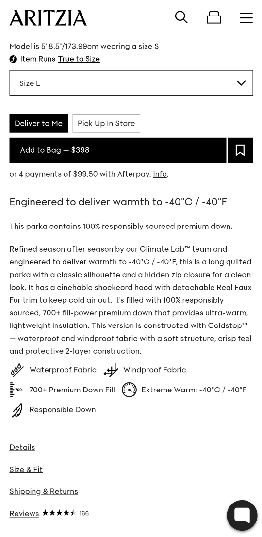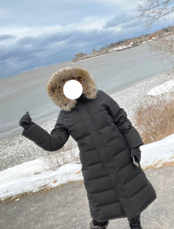 10Long black parka. Features a faux fur trimmed hood. Zipper closure. Down-filled. Waterproof and windproof. Excellent for cold weather.