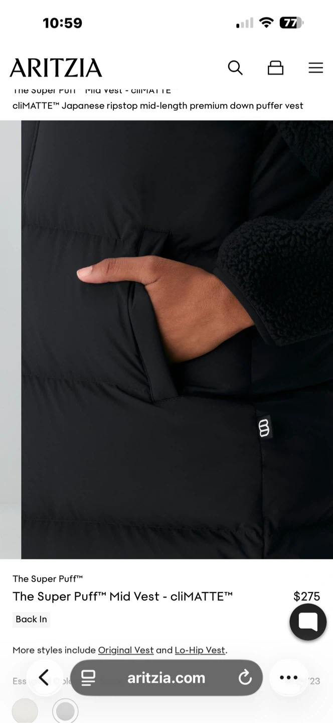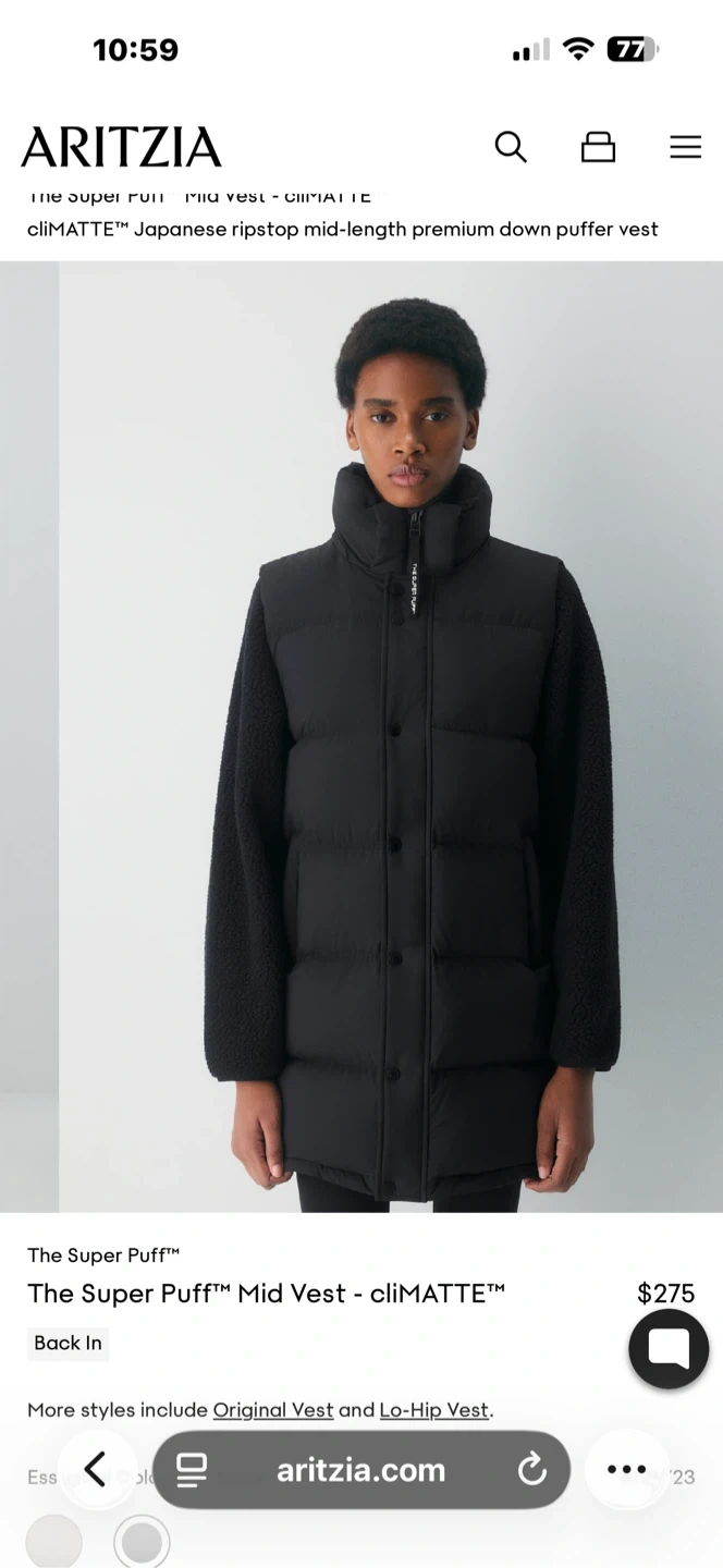 5Selling an Aritzia The Super Puff™ Mid Vest in cliMATTE™ fabric. It's a Japanese ripstop mid-length premium down puffer vest. Originally bought for $275!