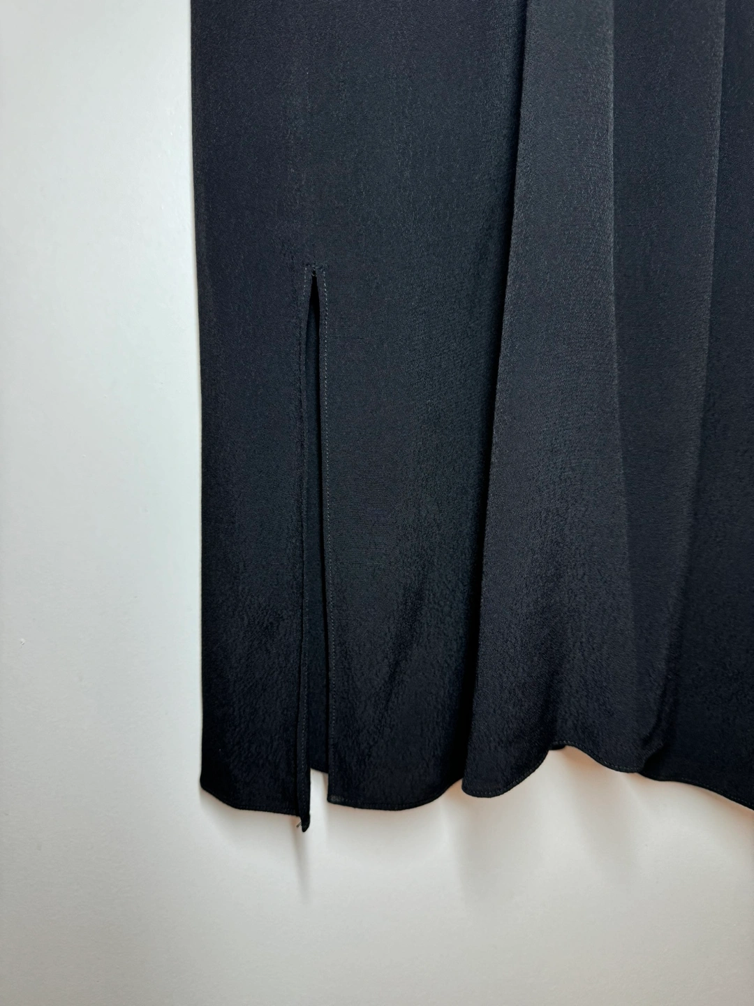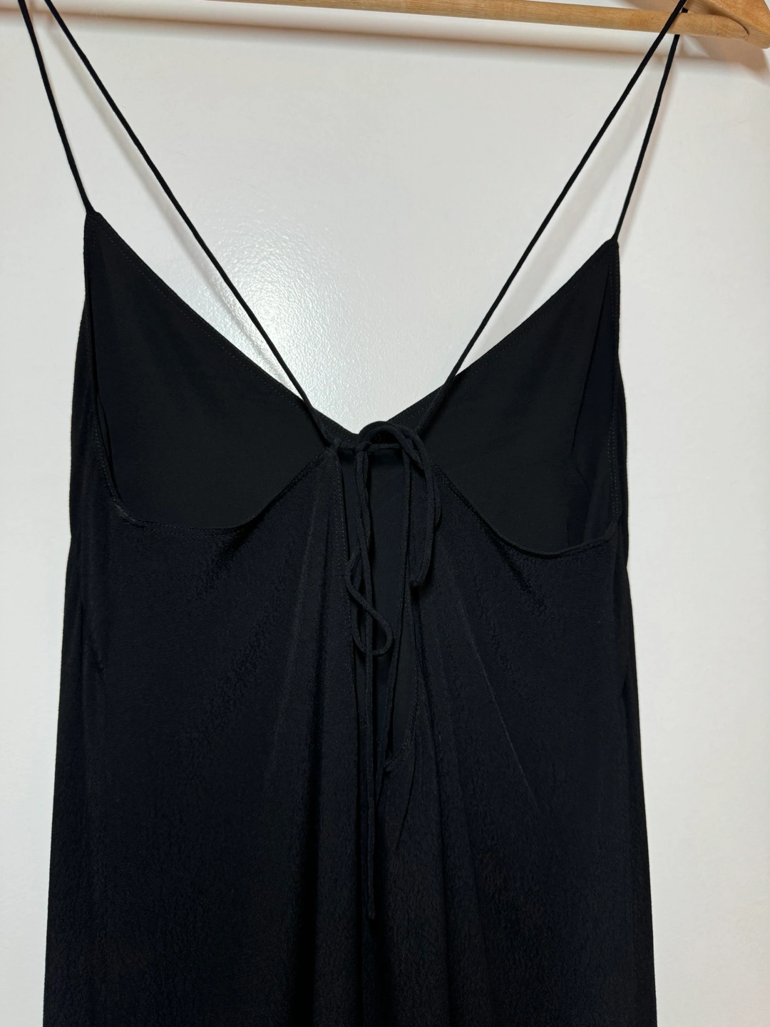 A black midi slip dress with an adjustable tie-up back and a modest side slit. Includes double lining. Great on its own or for layering! Pick up at Yonge-Sheppard