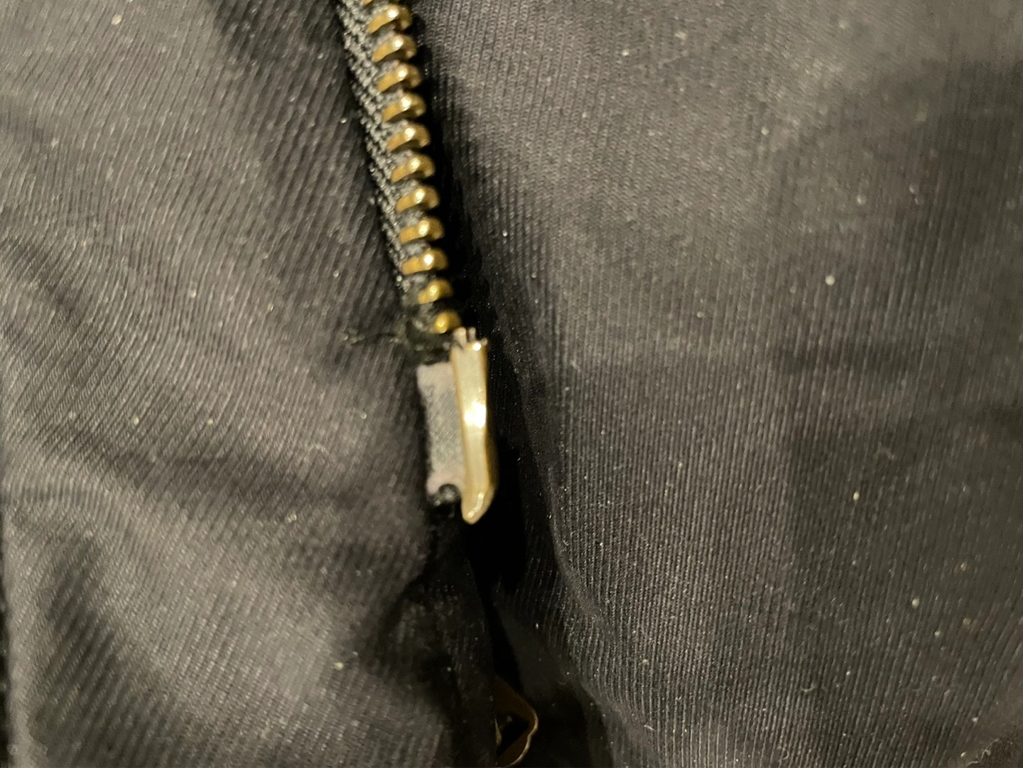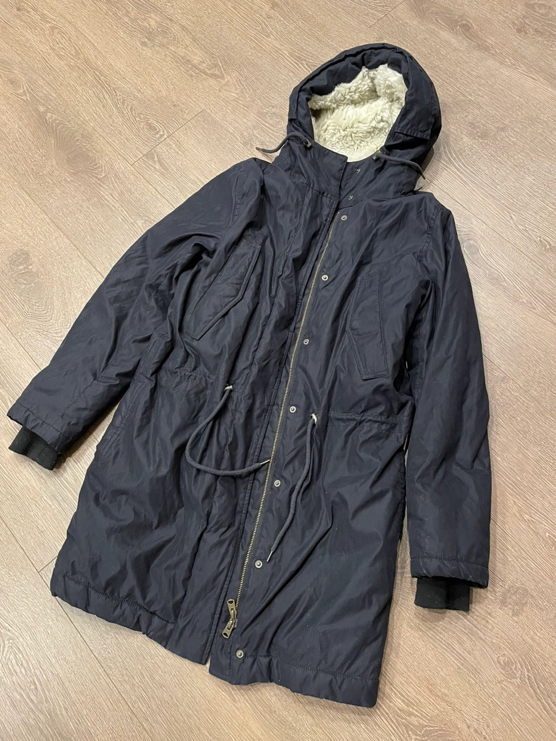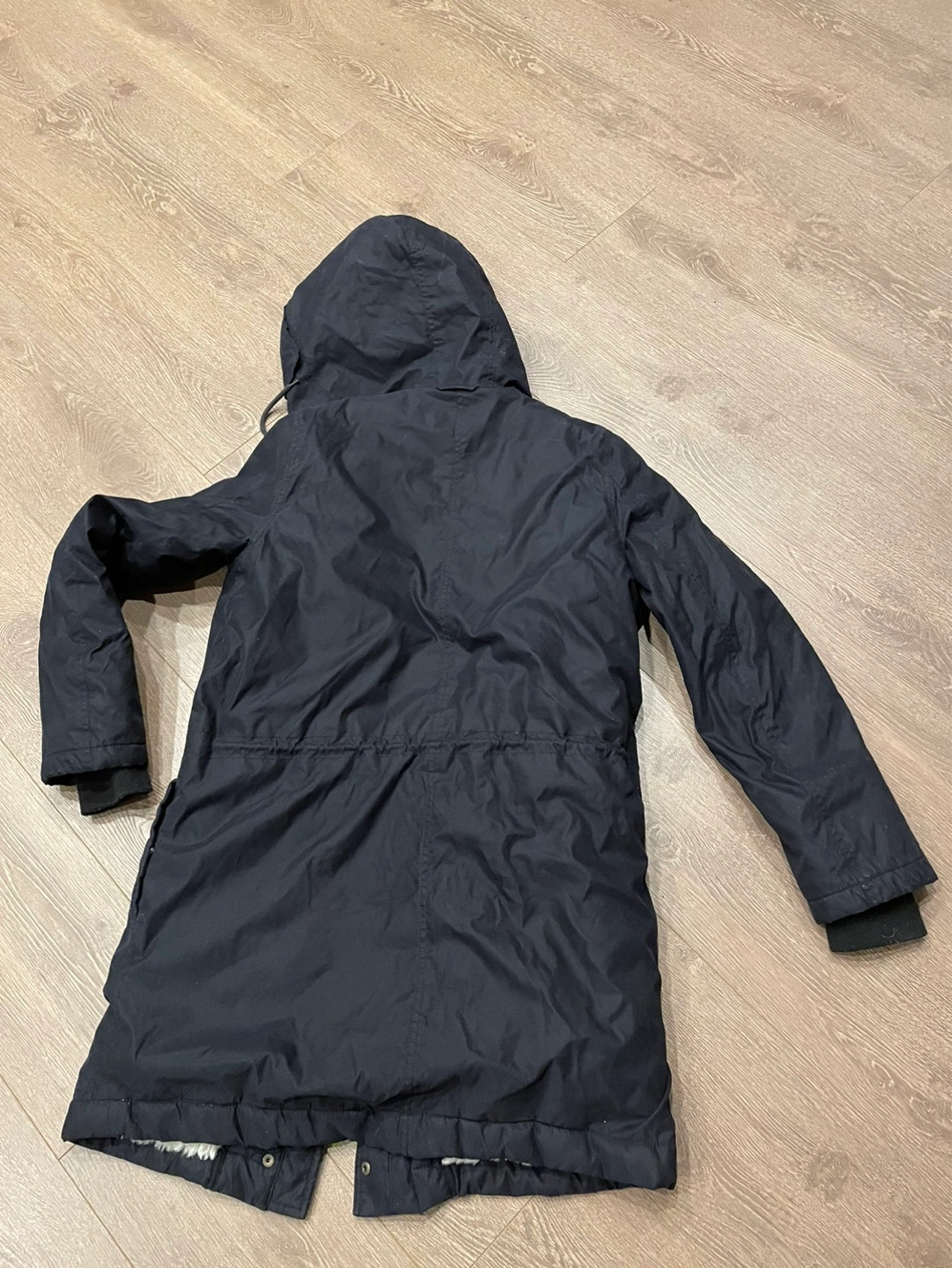 31Women's black parka, size small. Features a sherpa-lined hood and drawstring waist. Long sleeves with ribbed cuffs. Professional dry clean only. The zipper is defected at the bottom.