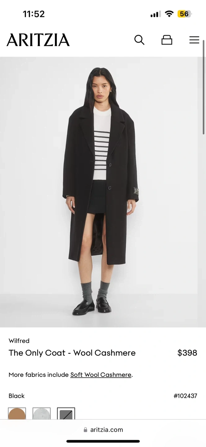 10Selling an Aritzia Wilfred The Only Coat in black. It's made from a soft wool cashmere blend and features a relaxed fit. The size is 2XS but fits like a small. Originally bought for $398 selling for 260. Was bought last year and worn only a handful of times.