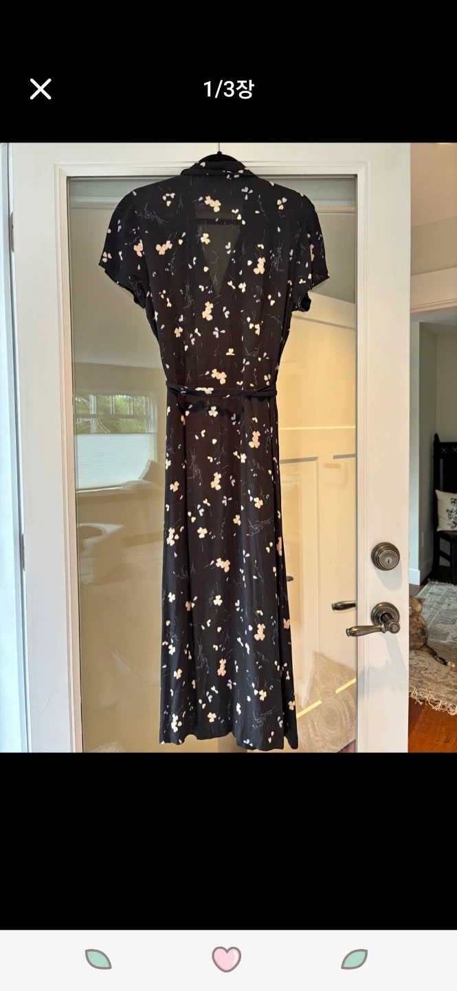 304This is a lovely midi dress with a black background and a delicate floral print. It features a flattering wrap style with a tie at the waist. Perfect for a casual day out or dressed up for an evening occasion!