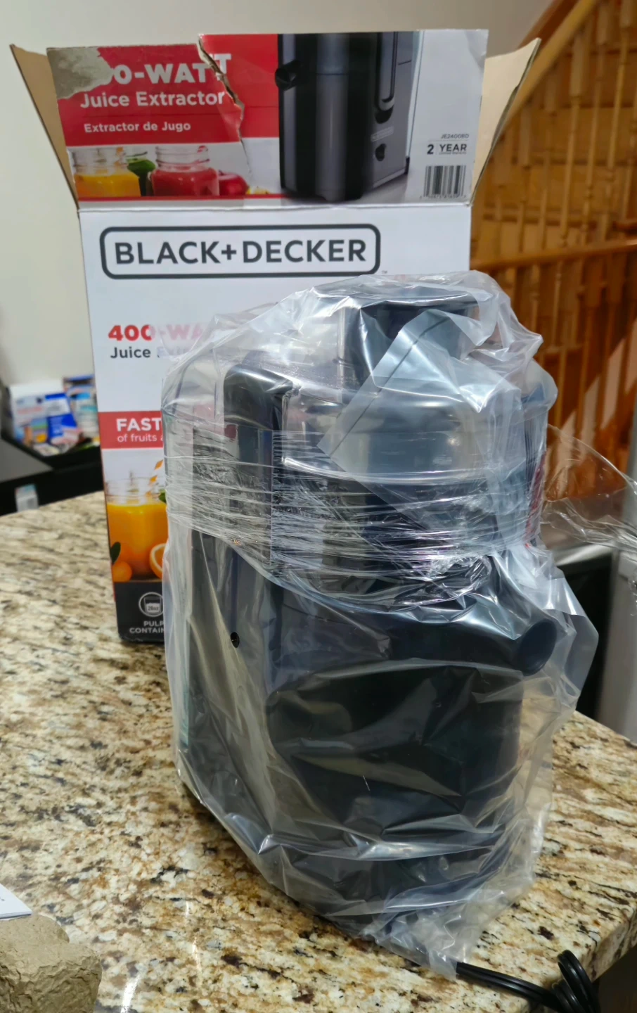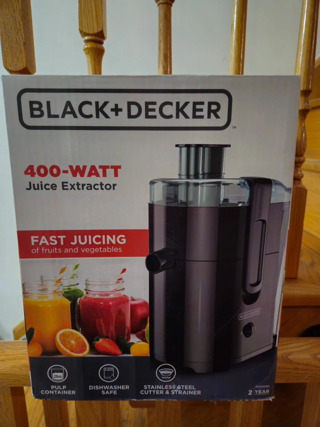 The BLACK+DECKER 400-watt juice extractor, model JE2400BD, remains sealed in its original packaging and has not been used. It is equipped with a 28oz pulp container, dishwasher-safe components, and a stainless steel cutter and strainer, making it suitable for efficient juicing of fruits and vegetables.