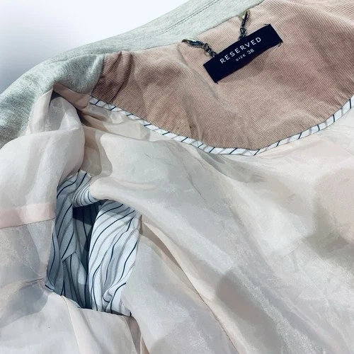 Add a refined, classic touch to your collection with this rare, impeccably tailored blazer from Reserved. This is a stand-out piece that features premium tailoring and unique details not found in standard mass-market jackets. It is in "Like New" condition, showing no signs of pilling, wear, or fading. Just missing the original front button. Can be easily replaced. Design Highlights: Aesthetic: Ideal for Dark Academia or Preppy styles. It pairs effortlessly with jeans for a casual-professional look or a skirt for a classic academic vibe. Signature Details: Features rare contrast corduroy elbow patches and matching trim on the pockets, providing a vintage-inspired aesthetic. Fabric & Fit: The 60% cotton-blend jersey offers the comfort of a knit with the sharp silhouette of a structured blazer. It is fully lined for a high-quality, comfortable fit. Approx. Flat Lay Measurements: P2P: 17" Length: 25" Sleeve L: 24"
