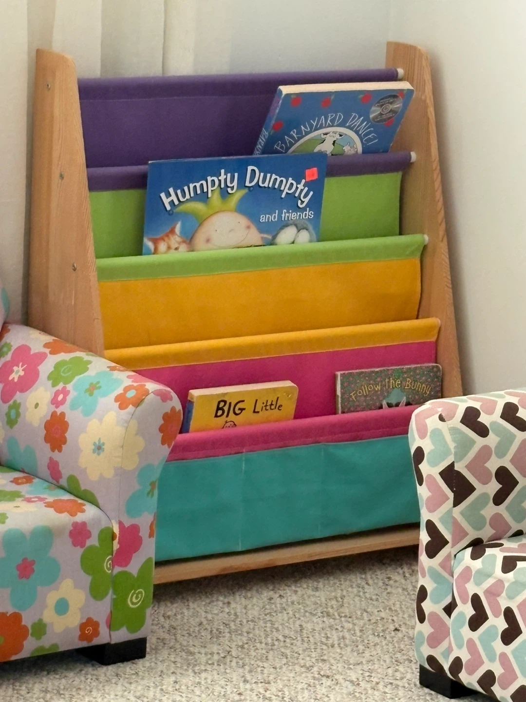 This bookshelf is designed for little ones with its colourful fabric pockets. It holds books upright, making them easy for kids to see and grab. It's a fun way to organize children's reading material!