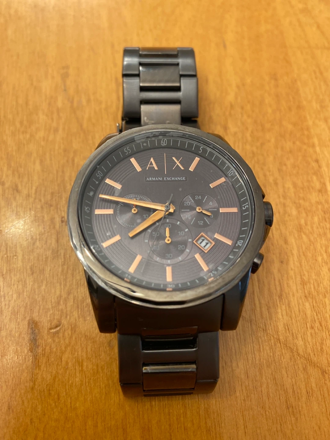 Selling an Armani Exchange watch. It features a dark grey face with rose gold accents and a black metal band. A stylish timepiece for any occasion!