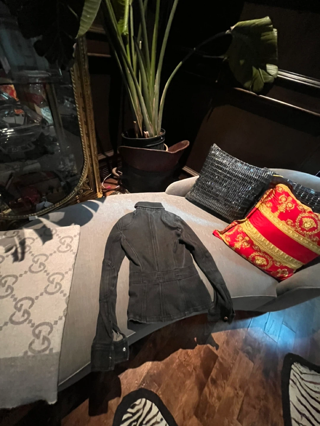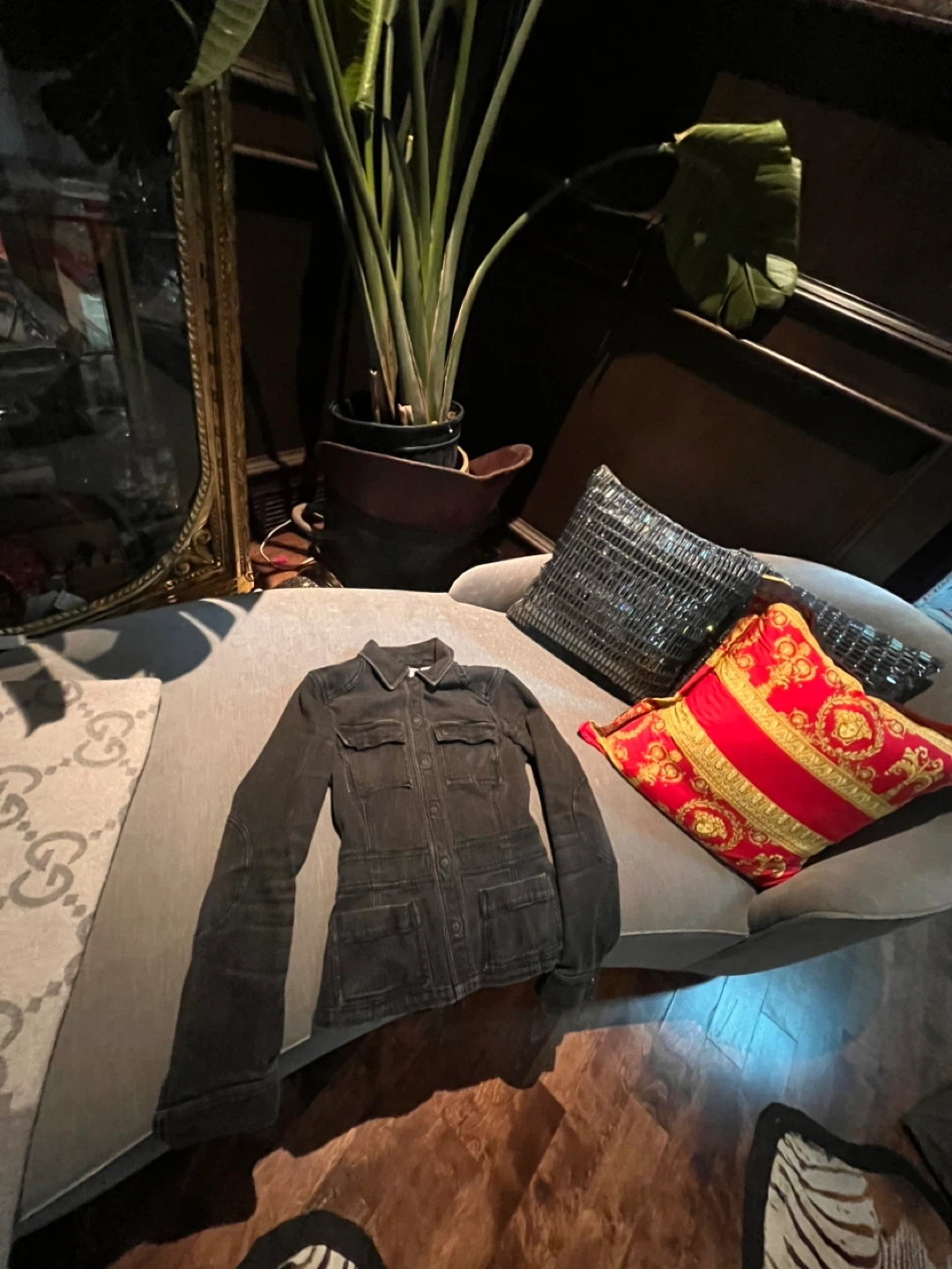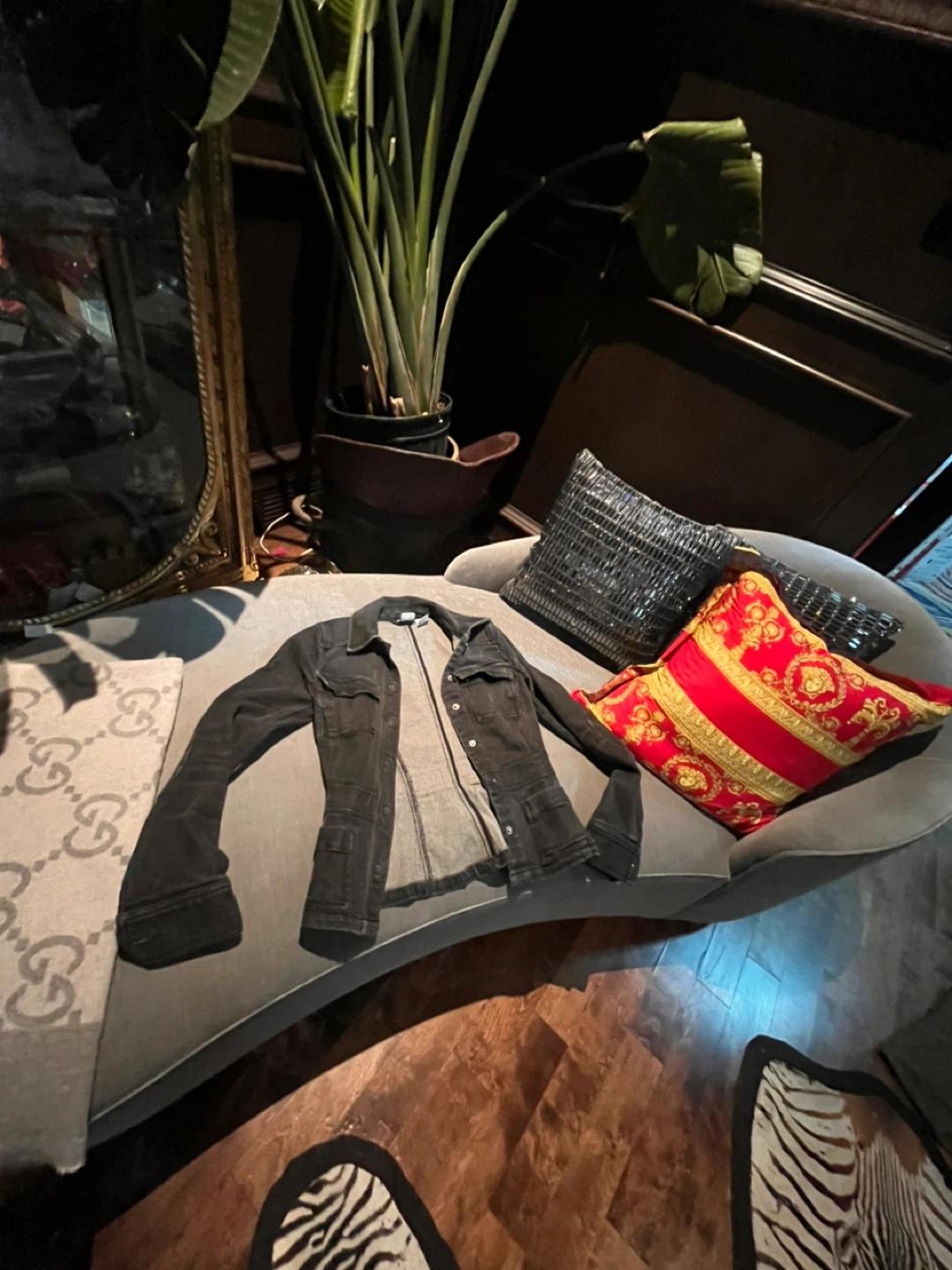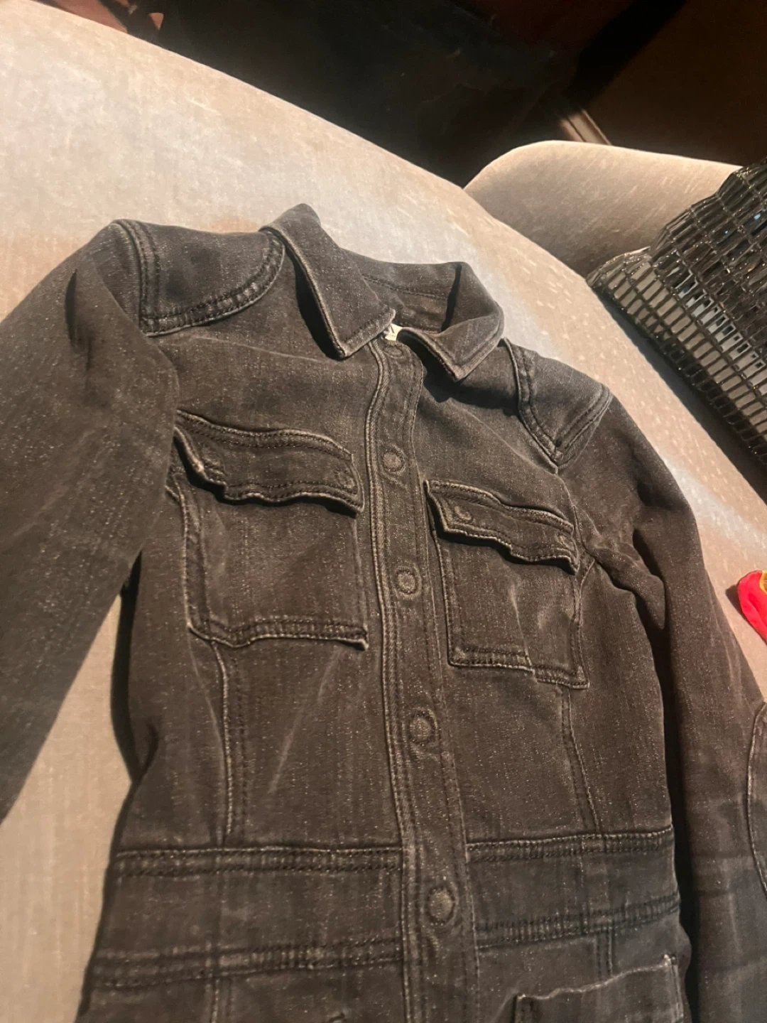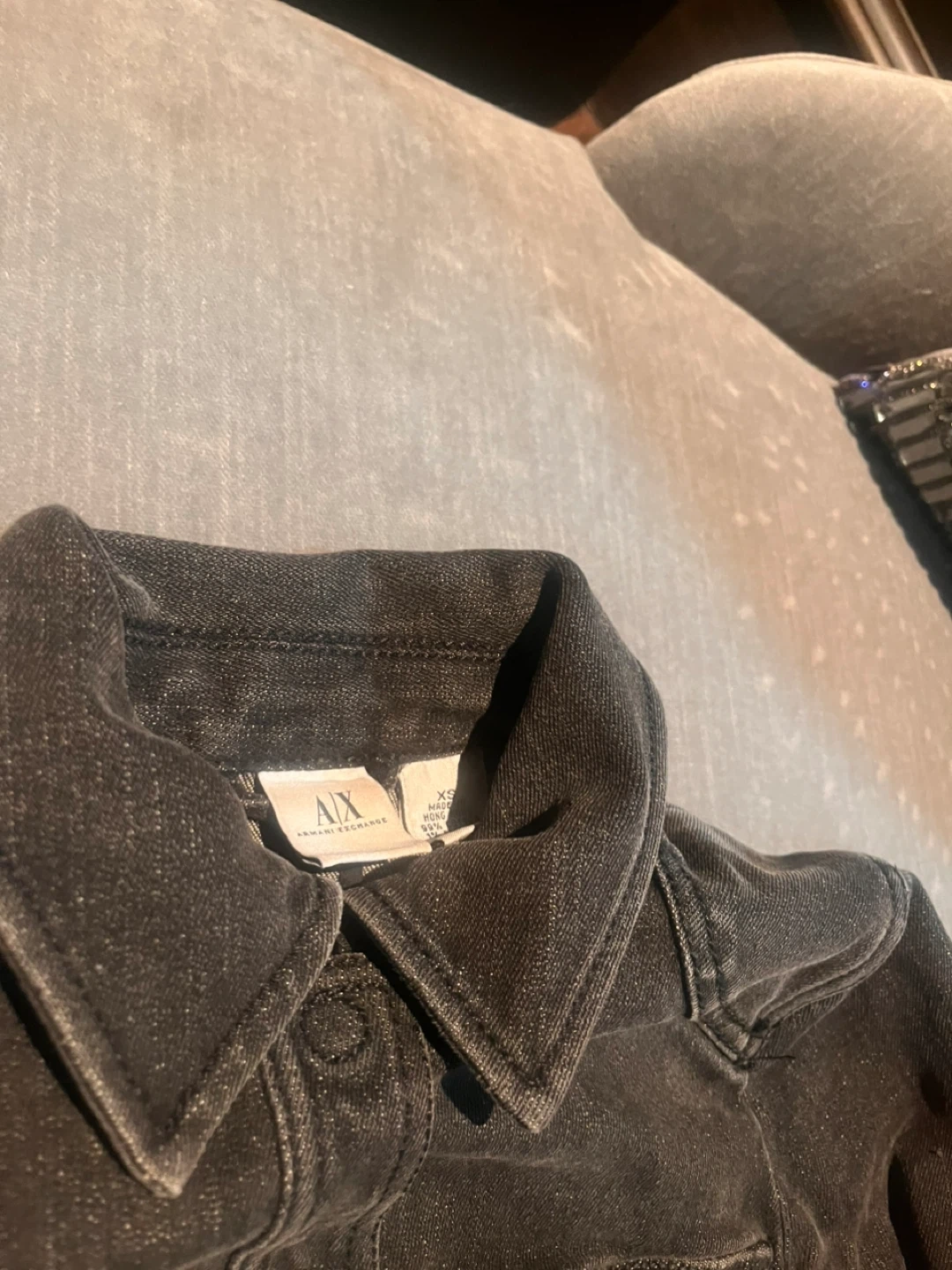 Here's a stylish black denim jacket from Armani Exchange. It's a size XS and in great condition! Perfect for adding a bit of edge to your wardrobe. It’s missing a button but still in perfect condition otherwise!