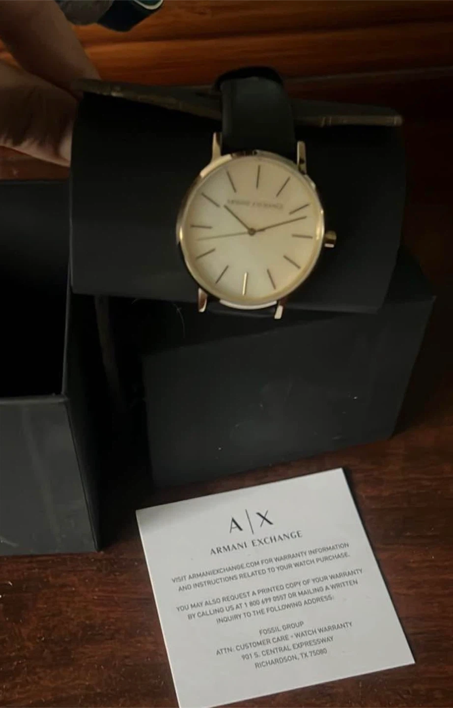 10Armani Exchange watch with a sleek design and a classic black leather strap. It comes with the original box and warranty information. The watch has a minimalist style, perfect for everyday wear!
