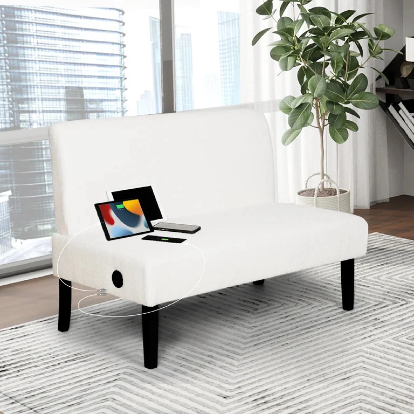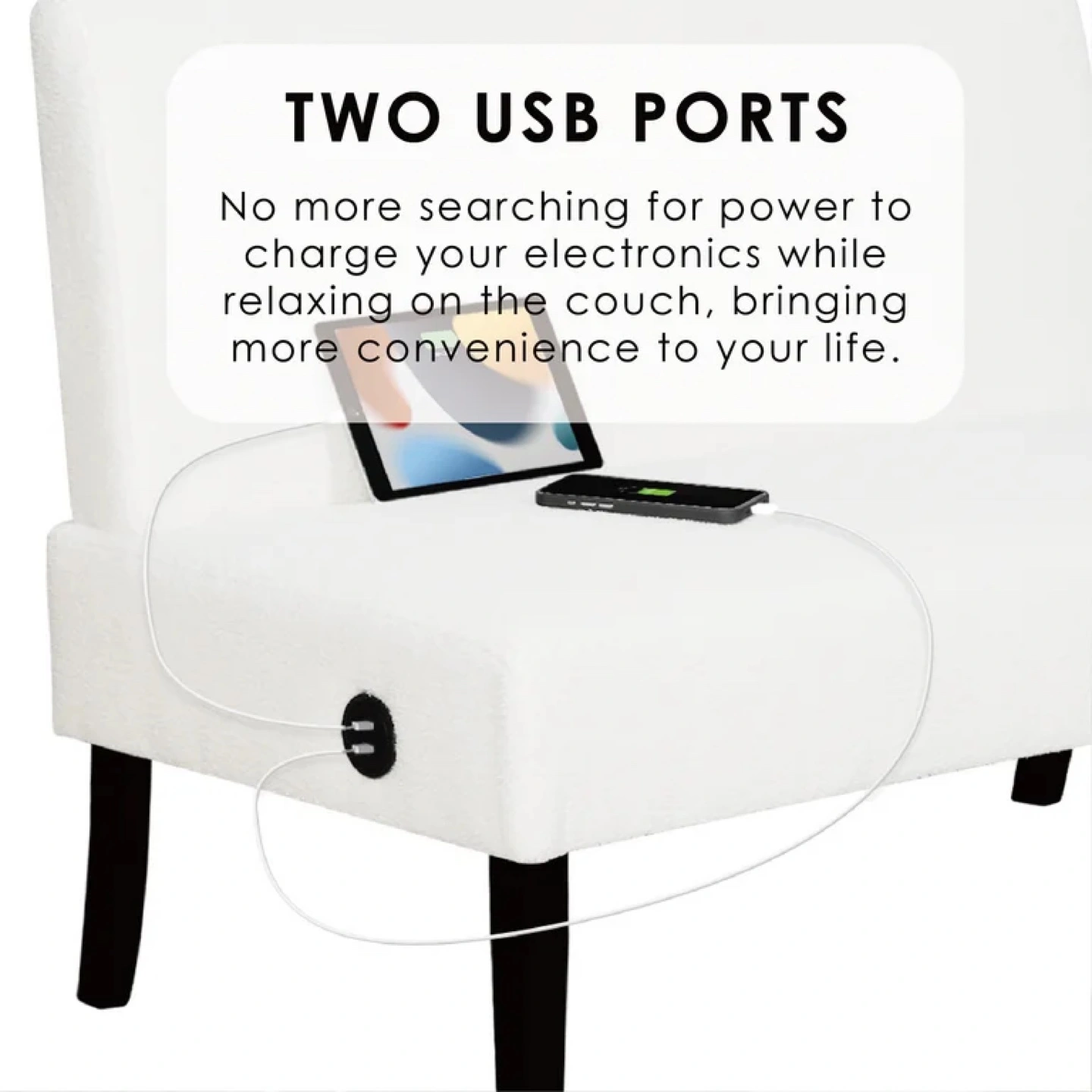 [2 USB Ports] :This small couch features 2 USB charging ports on one side, allowing for long-term power supply while playing games or watching videos. [Comfortable Experience]:The seat cushion of the mini couch is filled with highly elastic foam and covered with soft doll cotton, providing ergonomic comfort. It also has a slight tilt of 105° degree, fitting the body better. [Stable Frame] :The backrest is securely linked to the seat cushion using 7 double-headed screws, ensuring stability and preventing shaking. Oak legs with foot pads are used to protect floors, and the sofa has a maximum weight capacity of 500lbs. [Multi-purpose Option]:Suitable for small spaces, this comfy couch works well in bedrooms, living rooms, offices, or dorms. It can maximize seating even in narrow areas such as hallways, entryways, or corners. [Product Specification] :The overall size of the couch is 43" x 24" x 34". Installation is easy, as the package includes a detailed manual and complete tool kit. The backrest and four legs can be easily installed within 15 minutes. Note that all accessories are inside the seat frame.