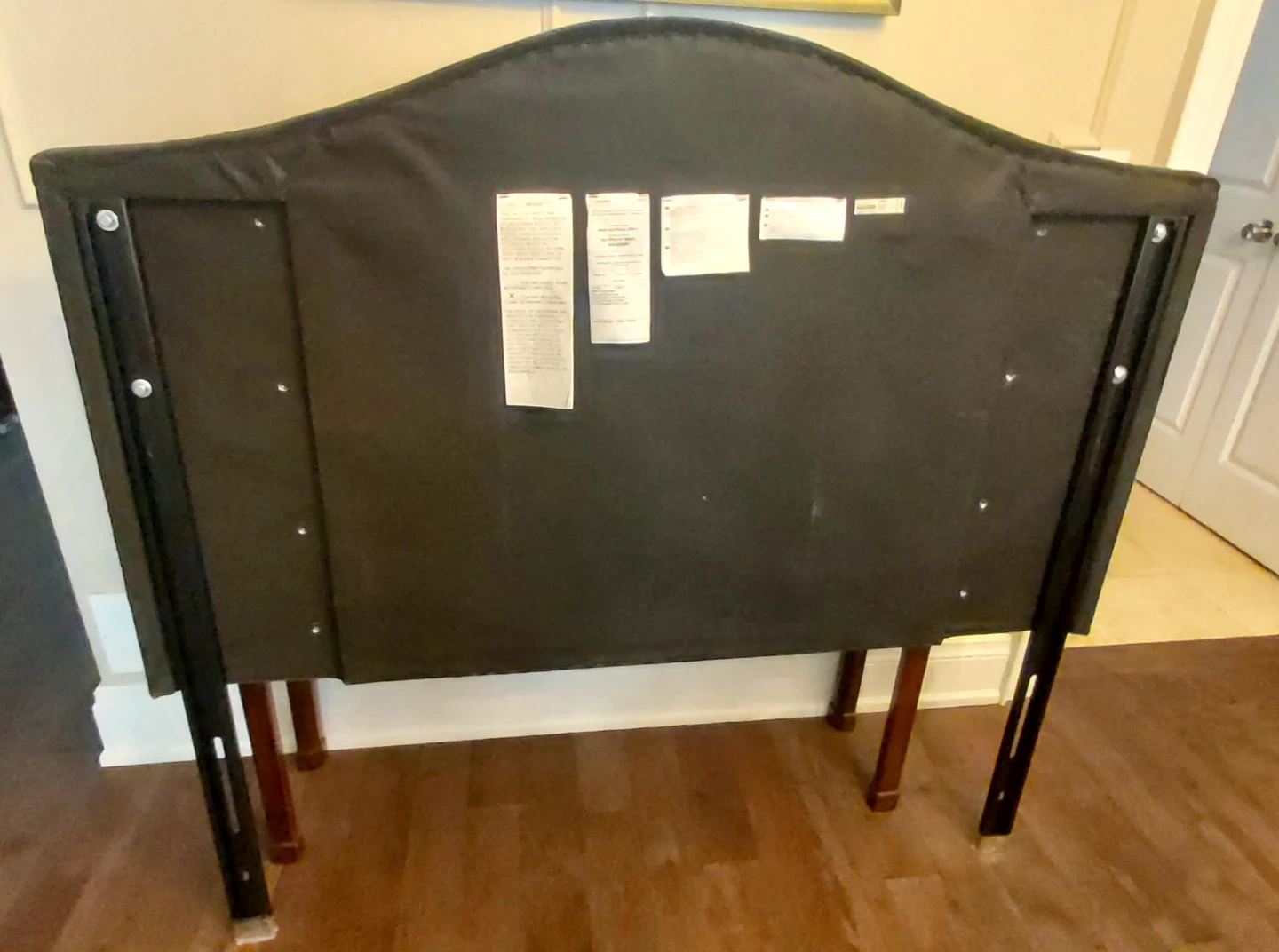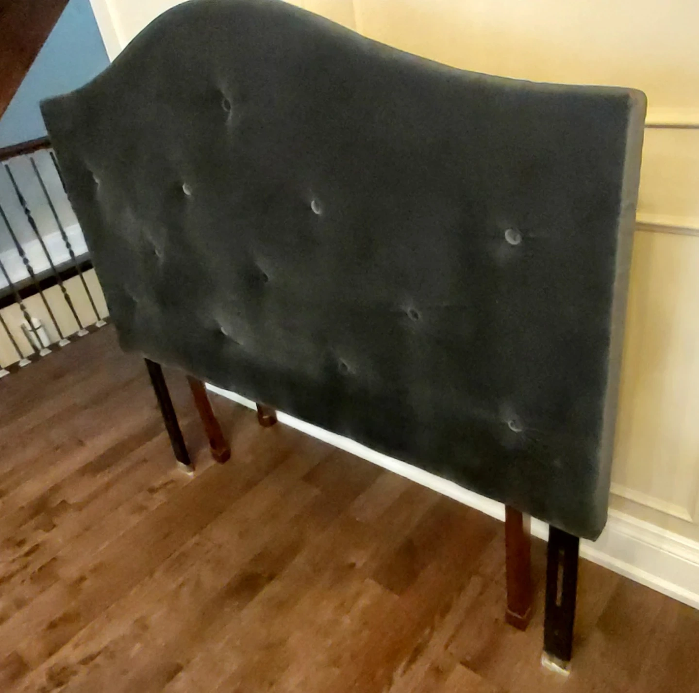 Navy velvet tufted upholstered headboard with curved top. Features metal legs for support. Attaches easily to a bed frame and height adjustable. Simple and elegant design for any bedroom.