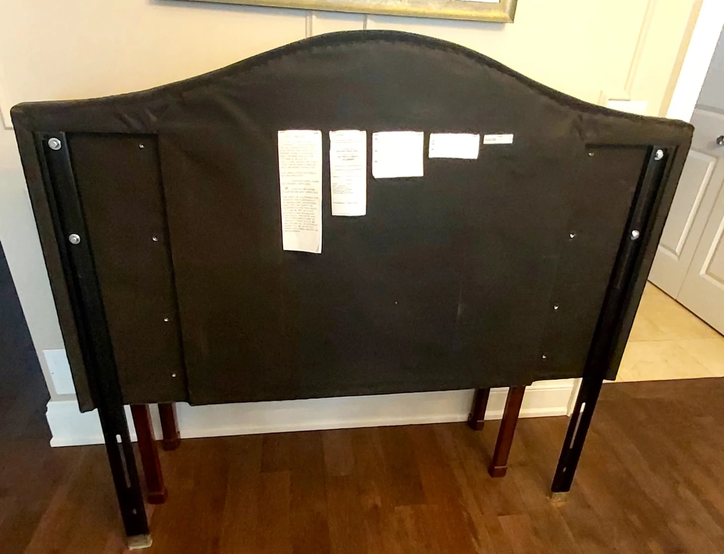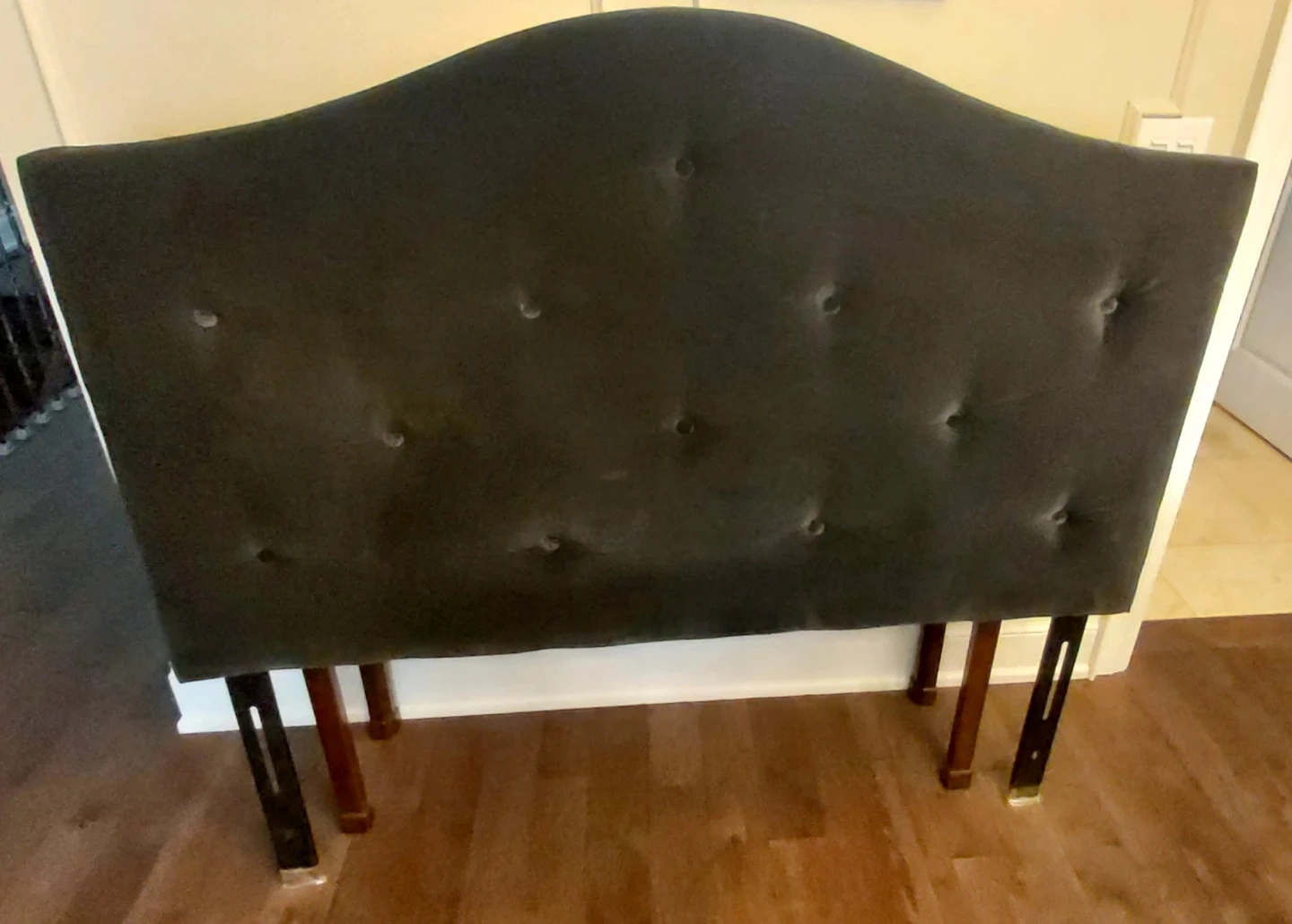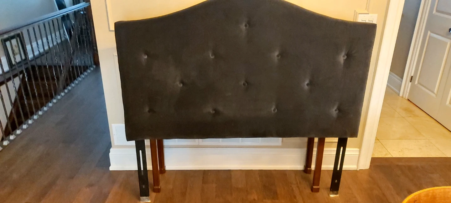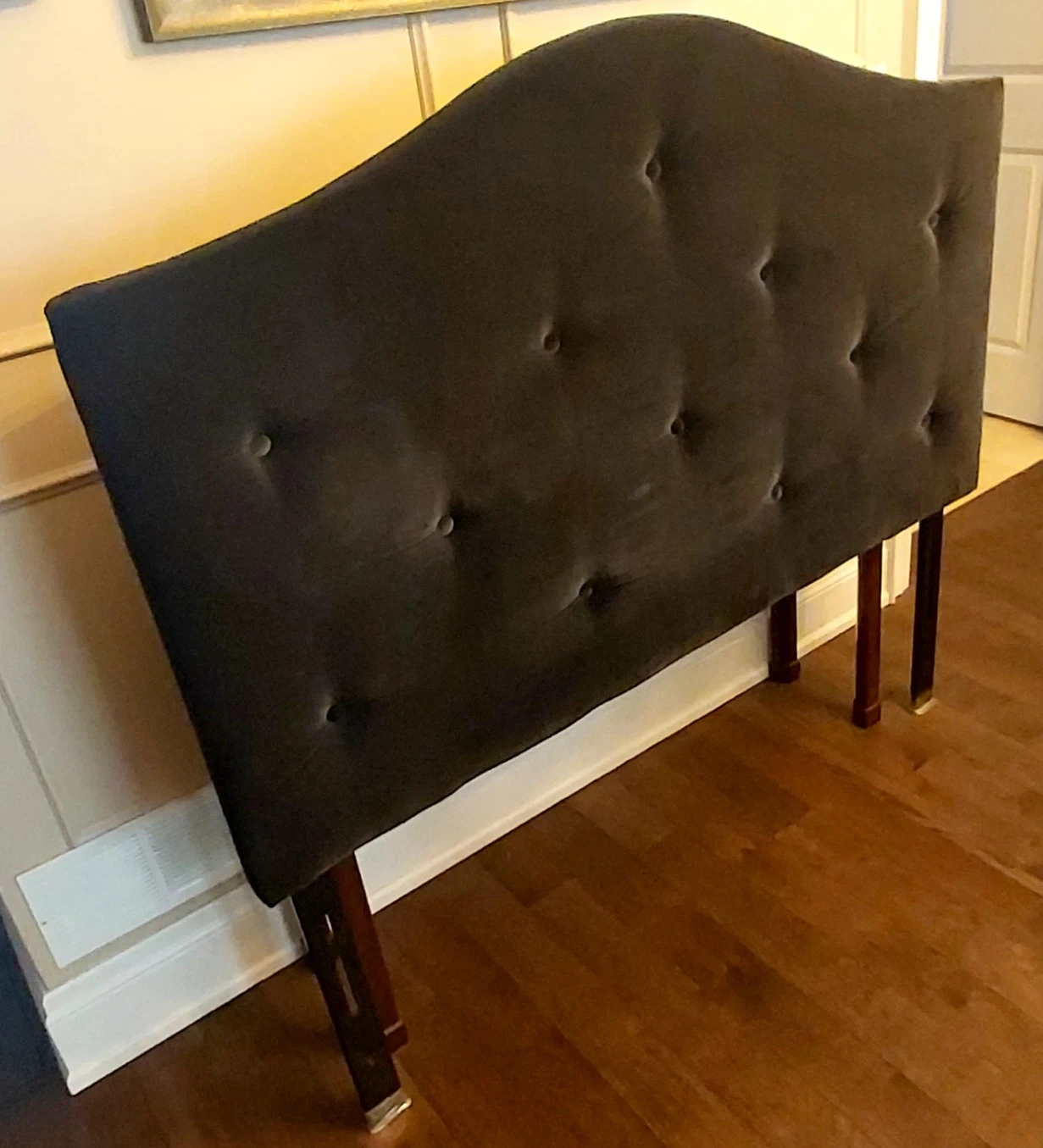 Navy velvet tufted upholstered headboard with curved top. Features metal legs for support. Attaches easily to a bed frame and height adjustable. Simple and elegant design for any bedroom.