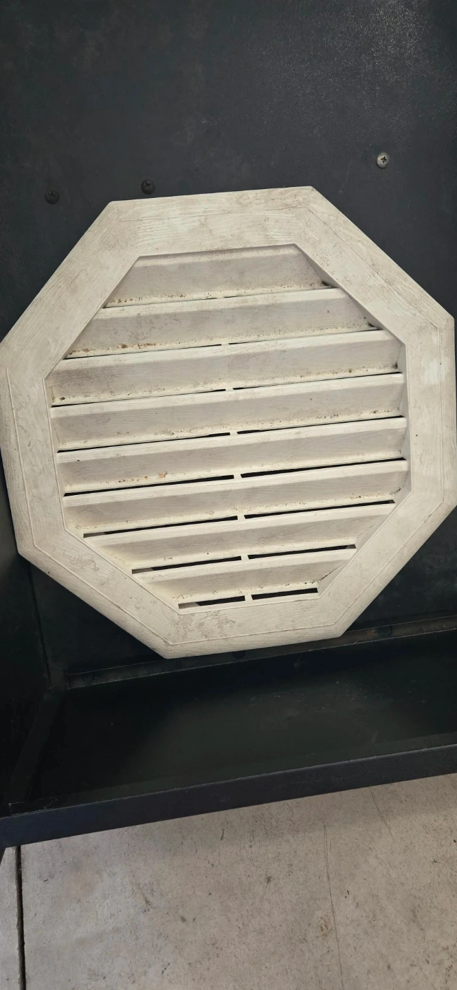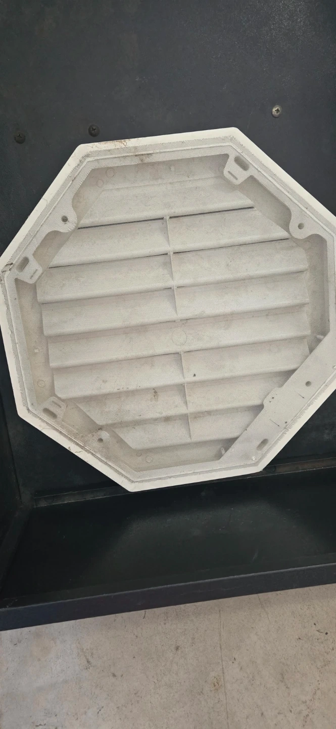 This is a white octagonal vent cover. It's made of plastic and features horizontal slats. It's suitable for covering ventilation openings. With screen on back side.