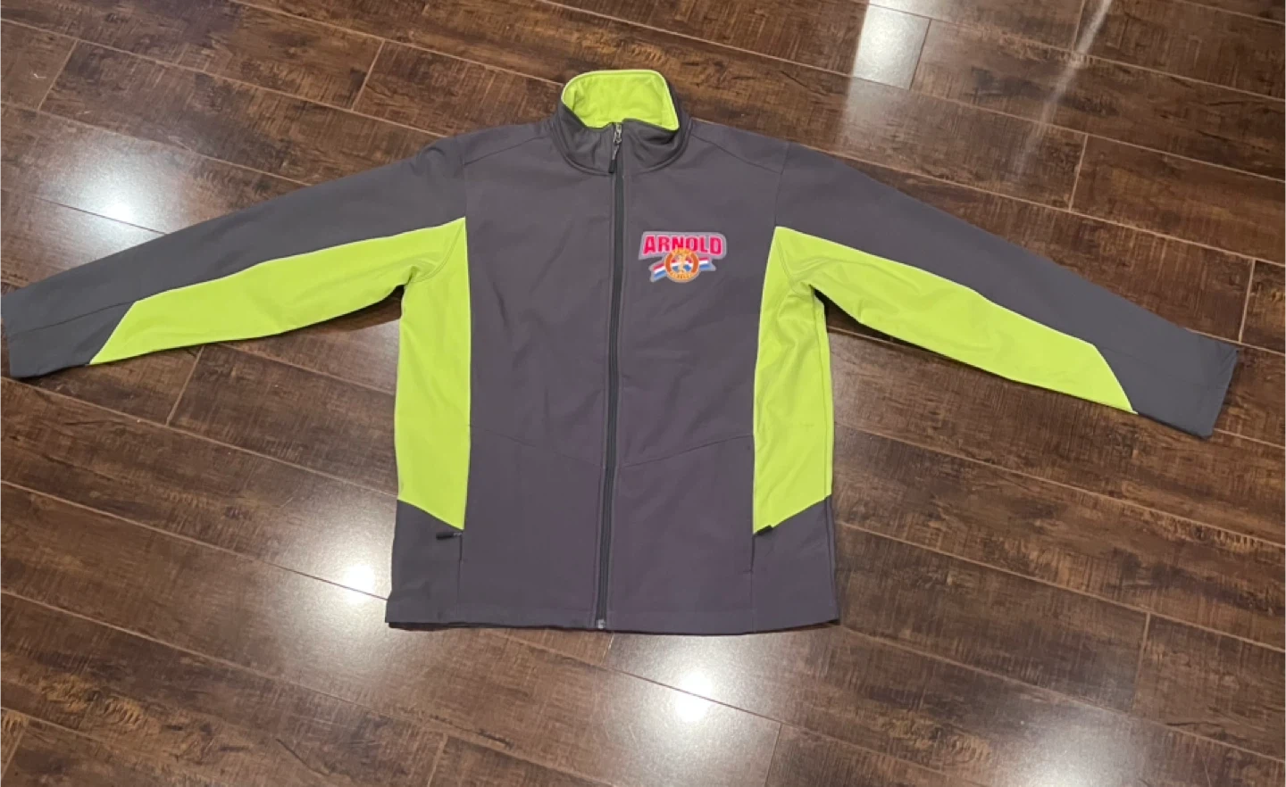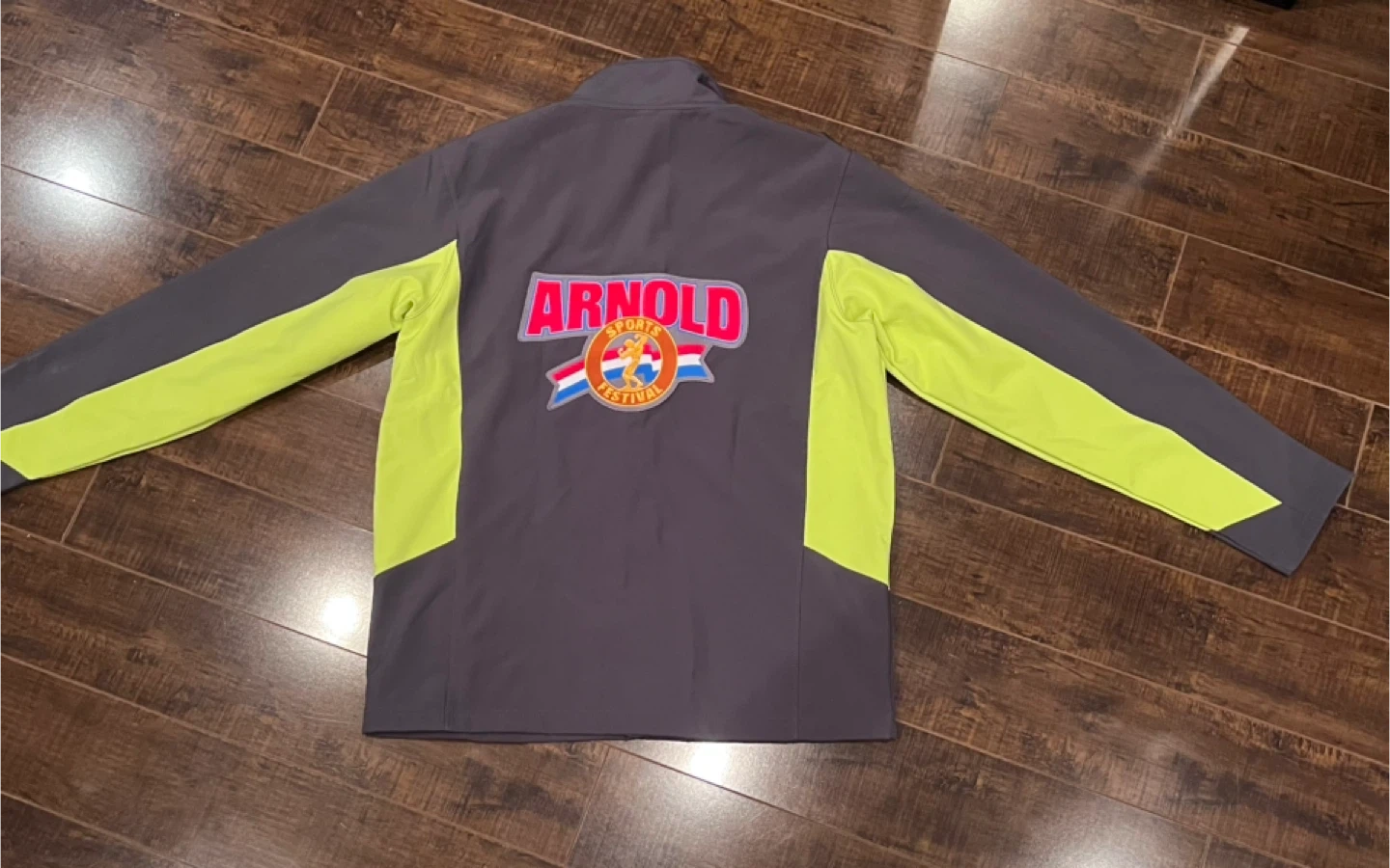 Selling an Arnold Sports Festival jacket. It's in great condition and features a unique design with grey and lime green accents. Perfect for fans of the festival or anyone looking for a stylish jacket!