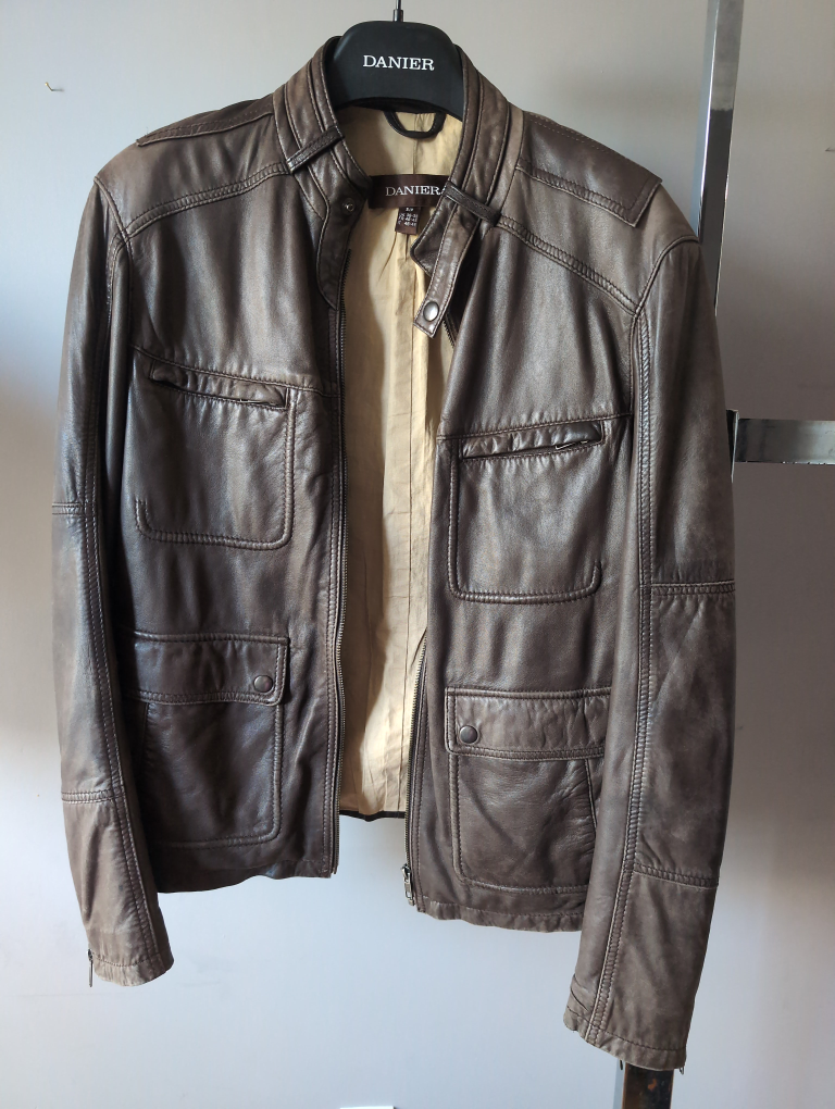 A stylish Danier leather jacket in a versatile brown colour. It features multiple pockets and a comfortable lining. Perfect for fall!