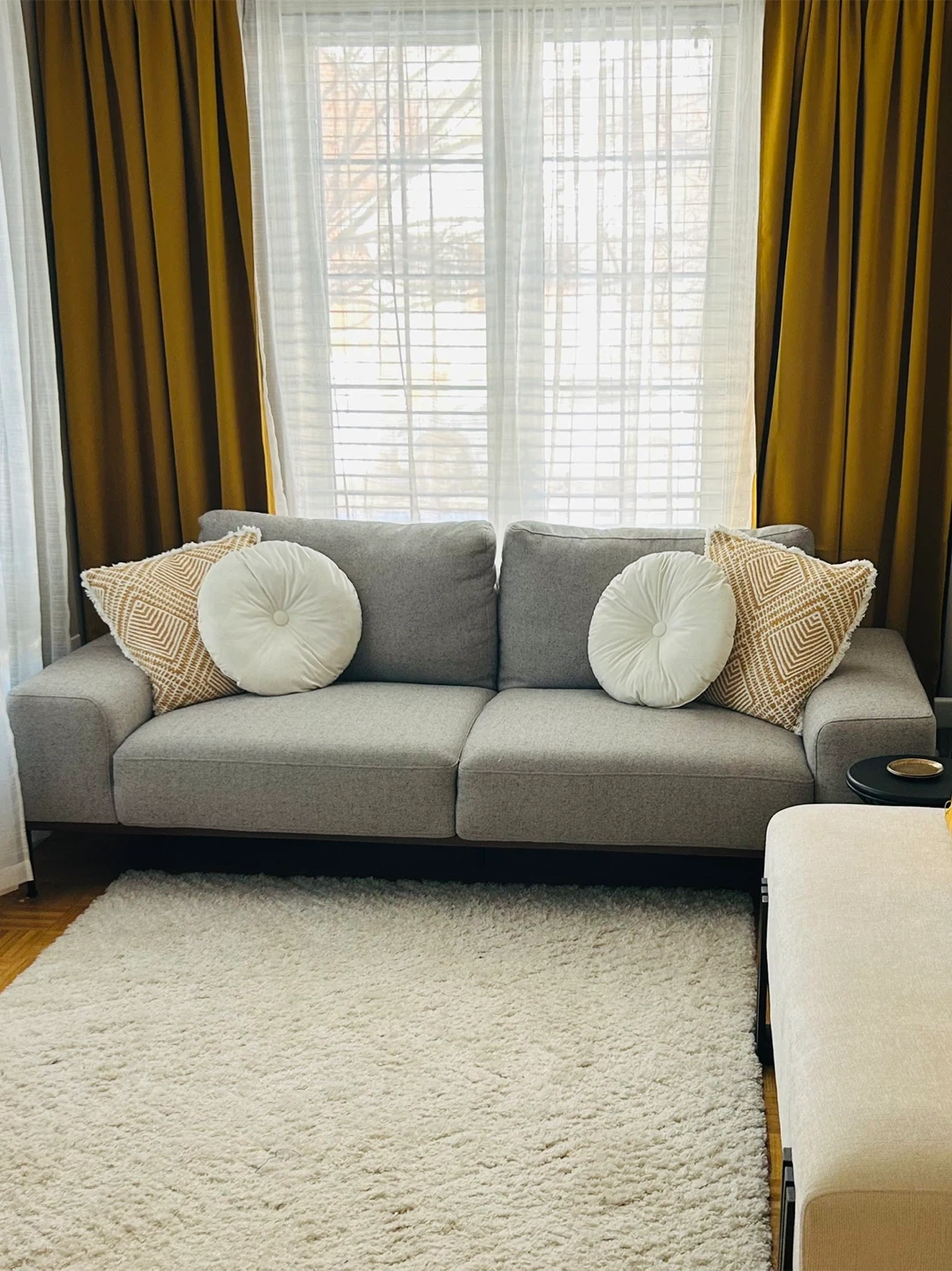 A comfortable grey fabric sofa. It comes with four accent pillows, two round white ones and two patterned square ones. The sofa's frame has a dark wood finish.