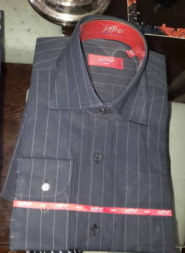 Selling a Joffre Paris dress shirt. It's a stylish black shirt with white pinstripes. The size is 39/40. It's in great condition and ready for a new home