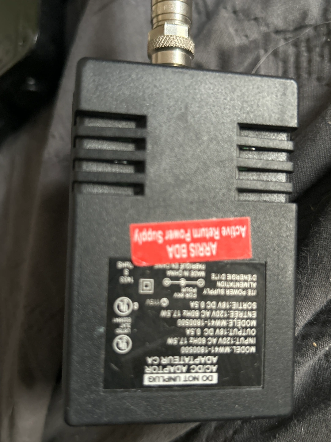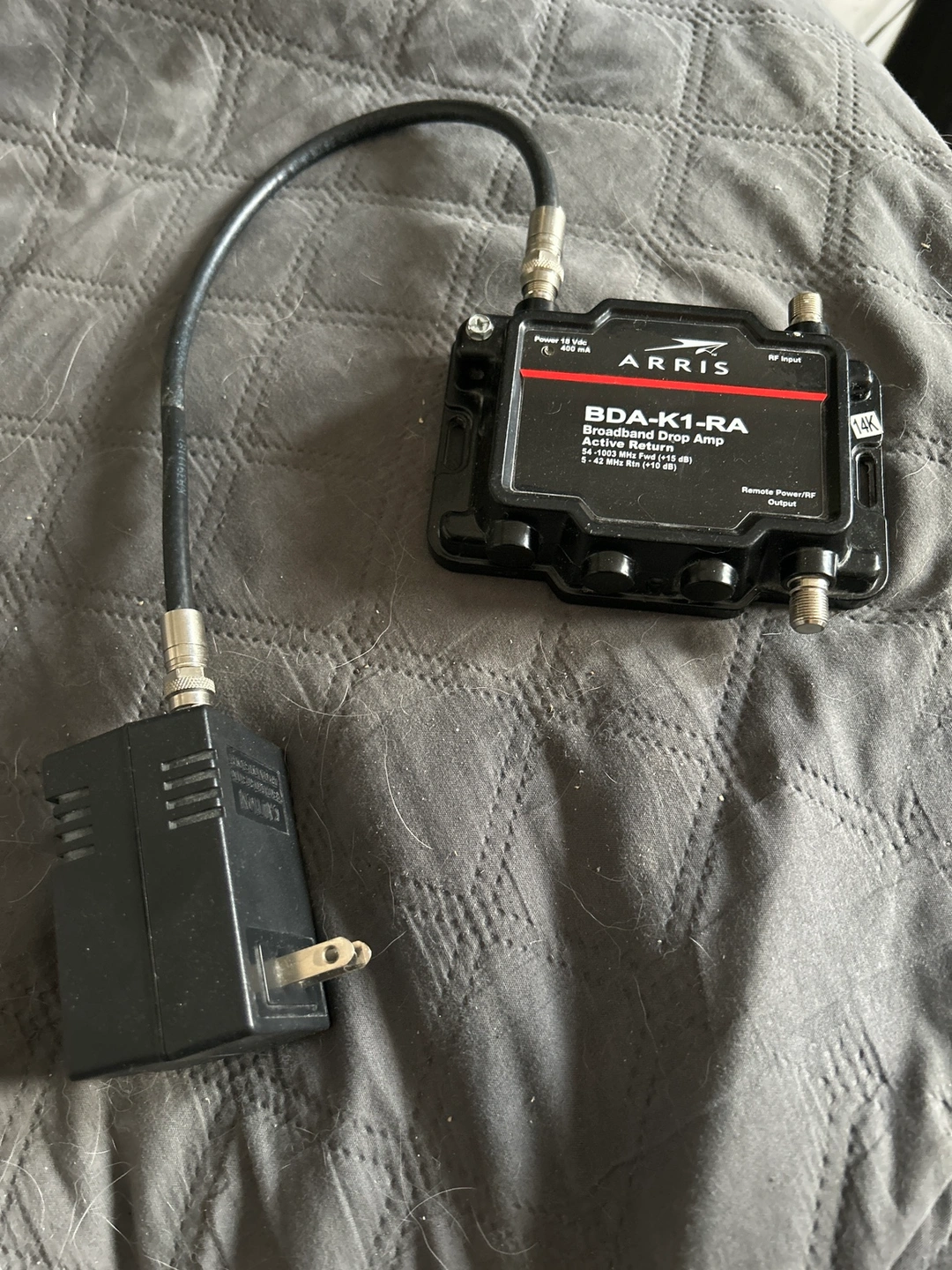 An ARRIS BDA-K1-RA Broadband Drop Amplifier. It has an included power supply. Moving sale. See my other items.