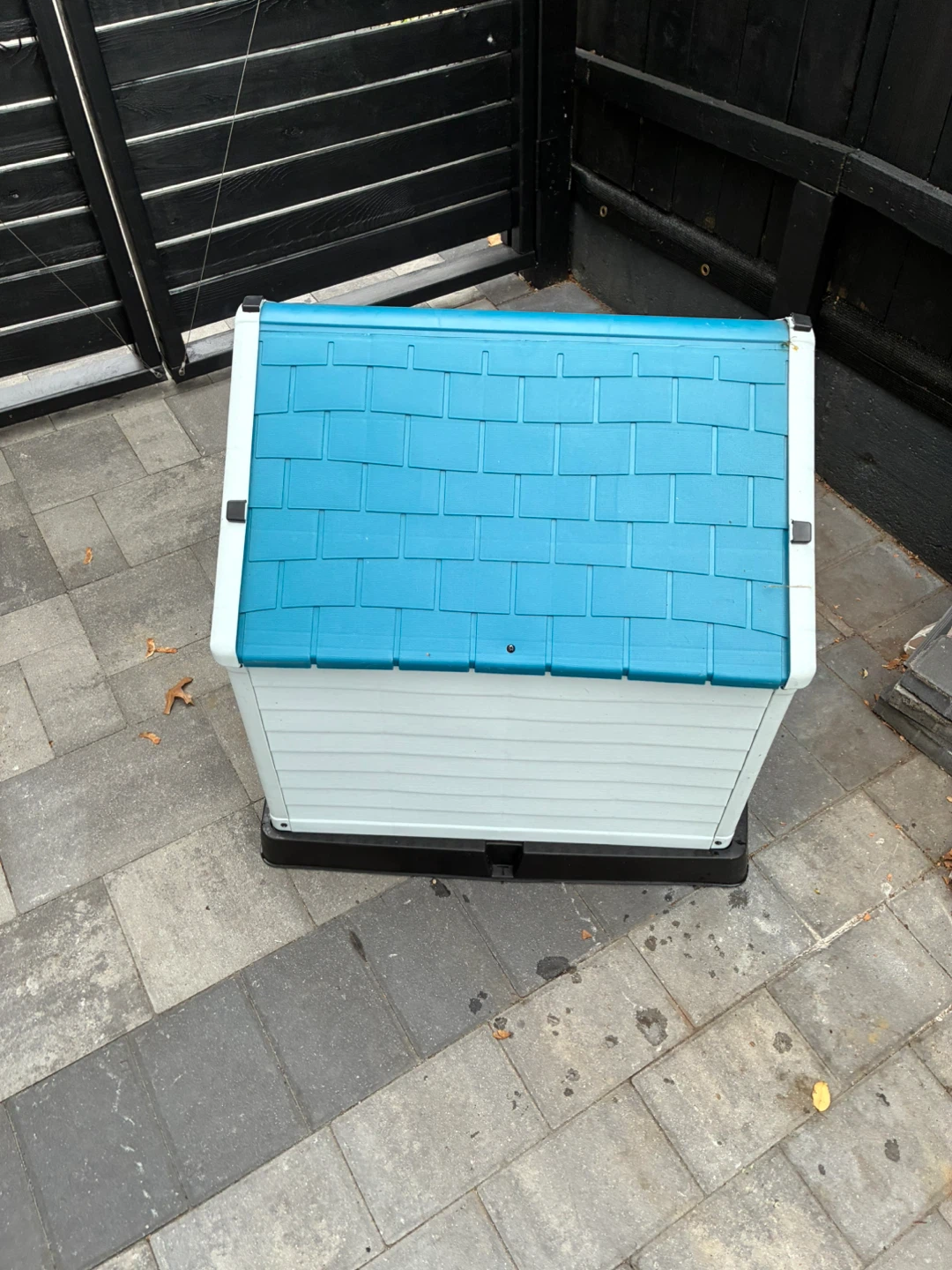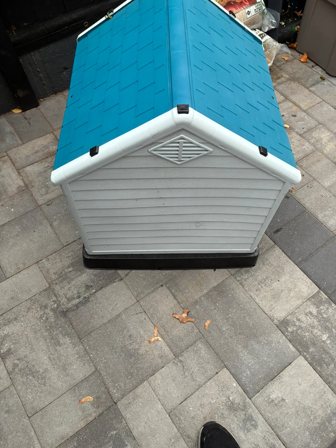 Dogloo Indigo dog house with a cool blue roof and white siding! It's in great shape and ready for a new furry friend. It's designed to provide comfort and protection from the elements for your dog