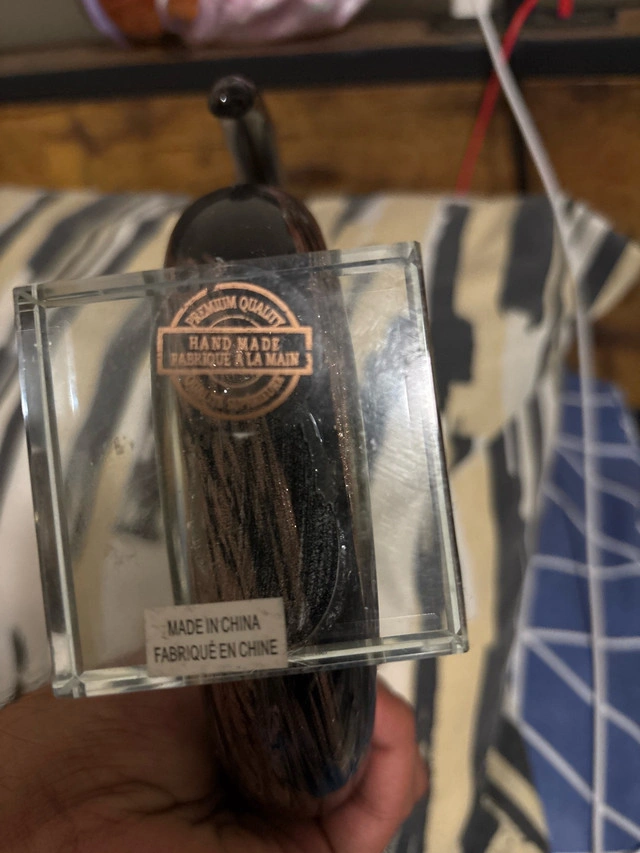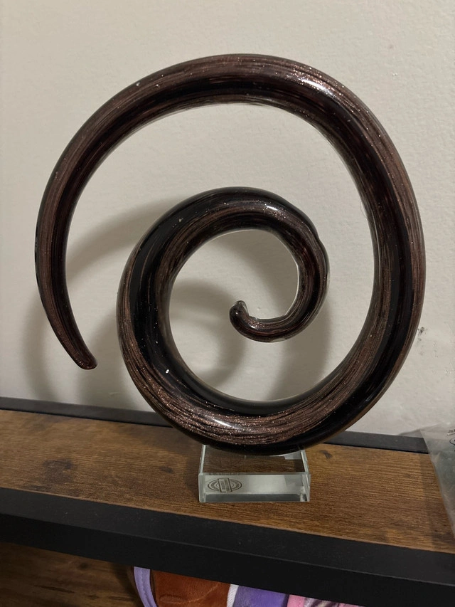 10This beautiful, used art glass sculpture features a striking spiral design in rich, dark brown tones with subtle glitter accents. It is mounted on a clear glass base. A sophisticated decorative piece to enhance any space, it shows some signs of wear. This captivating sculpture adds a touch of elegance and intrigue to your home decor!
