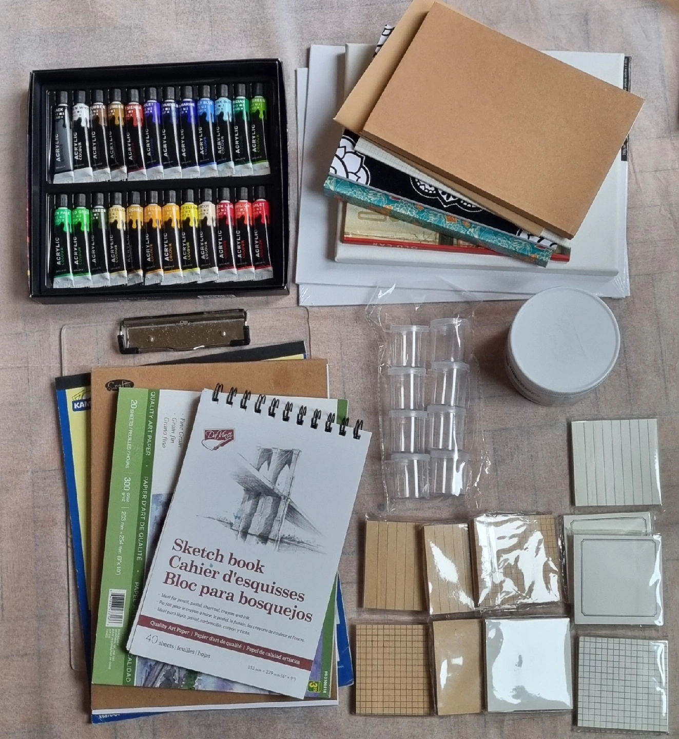 Selling a variety of art supplies! This bundle includes: - A set of Lanpo 24 Premium Acrylic Colours - Mont Marte gesso to prepare canvases - Sketchbooks and notebooks - Small canvases and paper Perfect for artists of all levels!